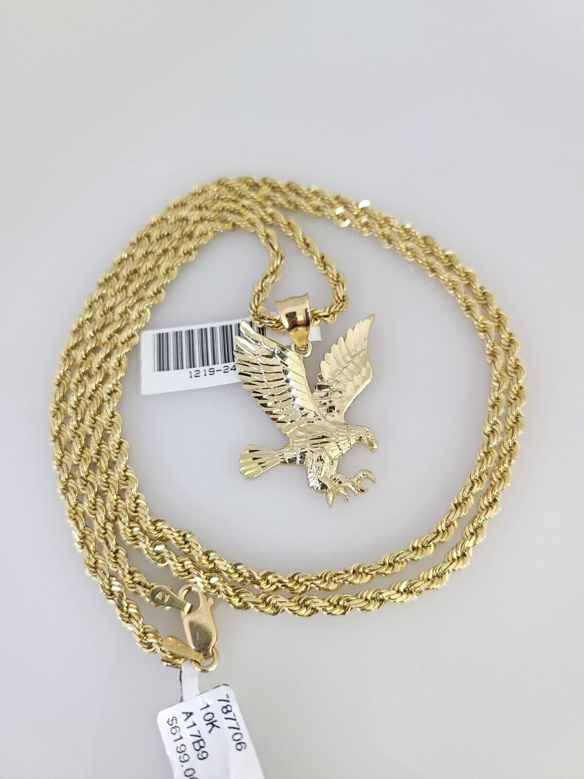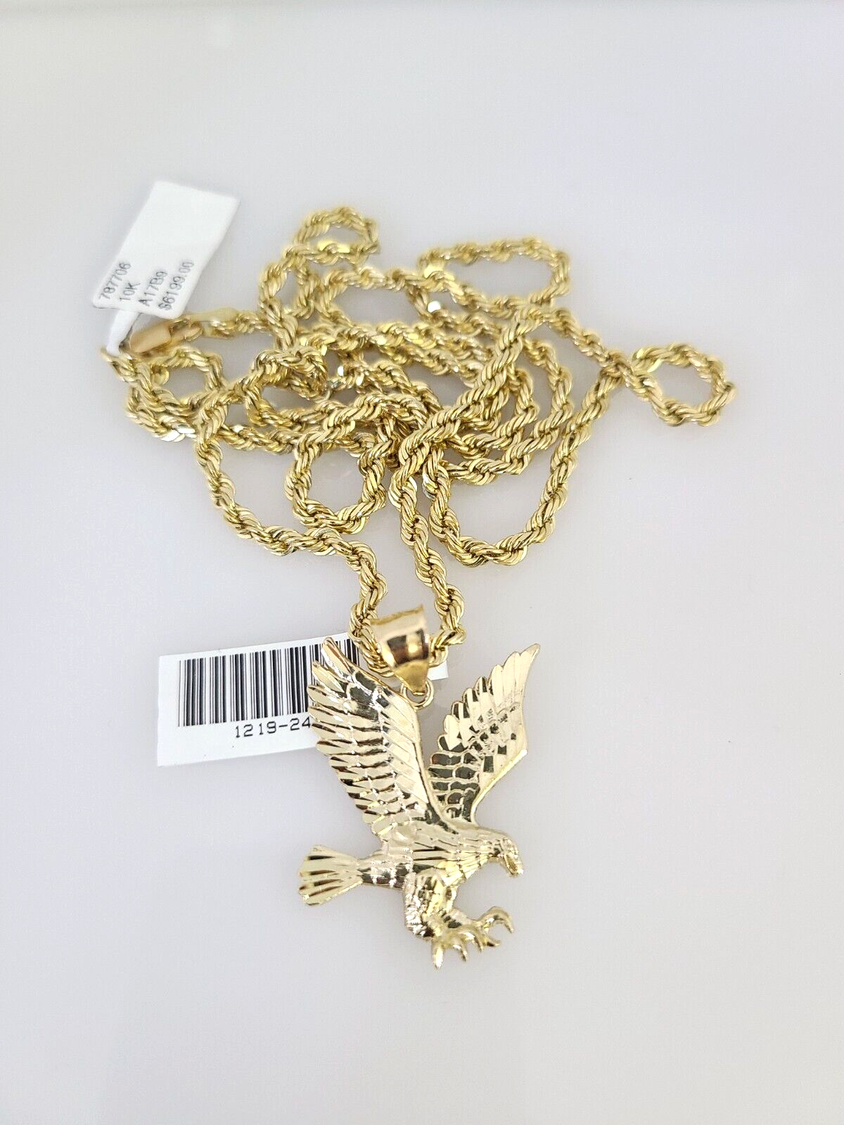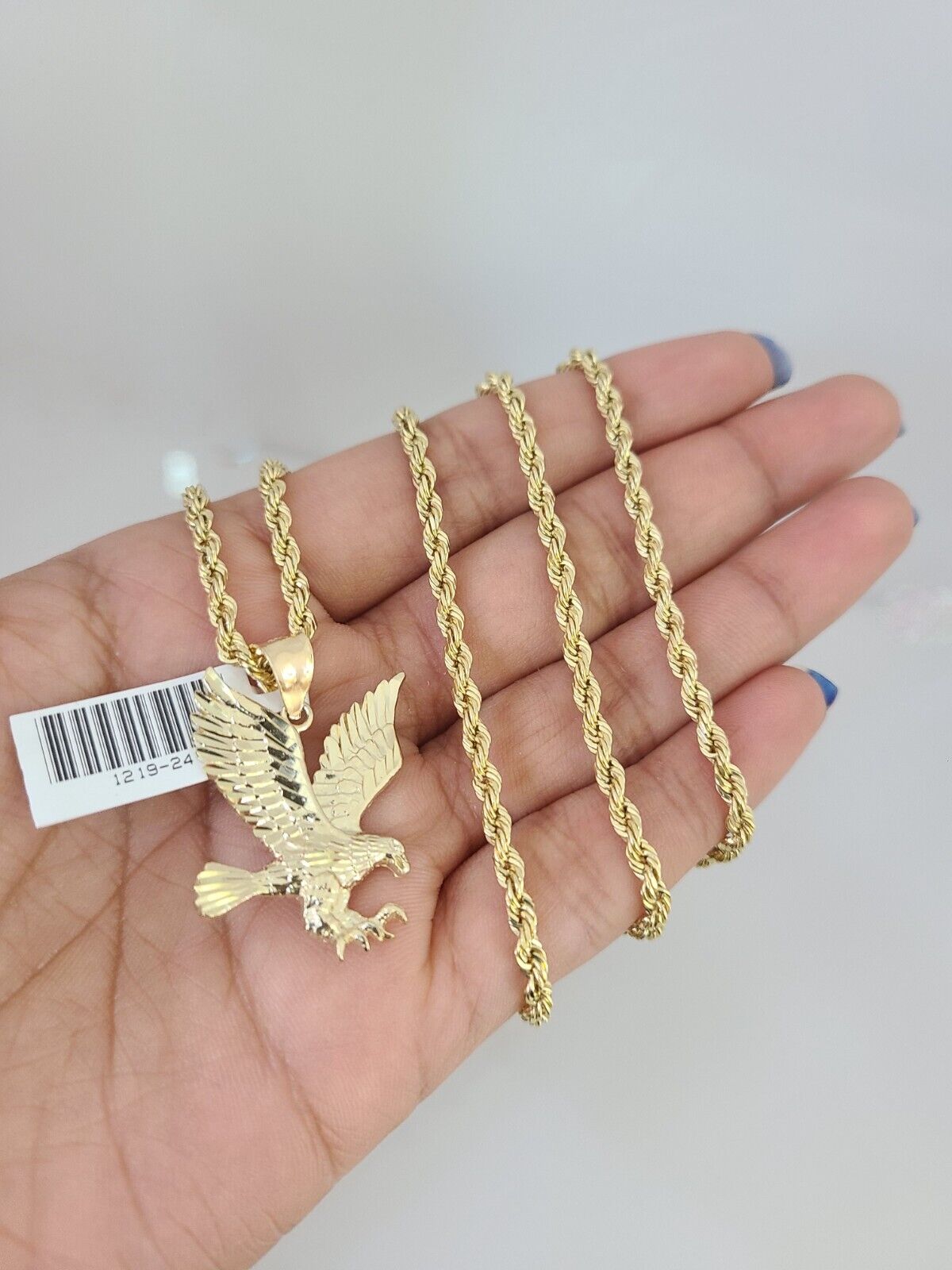REAL 10k Solid Rope Chain Flying Eagle Charm Pendant 3mm Set 18"-26" in Necklace