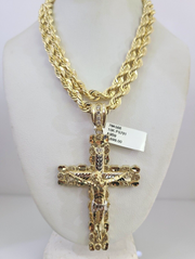 Real 10k Solid Rope Chain Jesus Cross Charm Set 6mm 20"-30" Inch Necklace Gold - 20" Chain with Charm