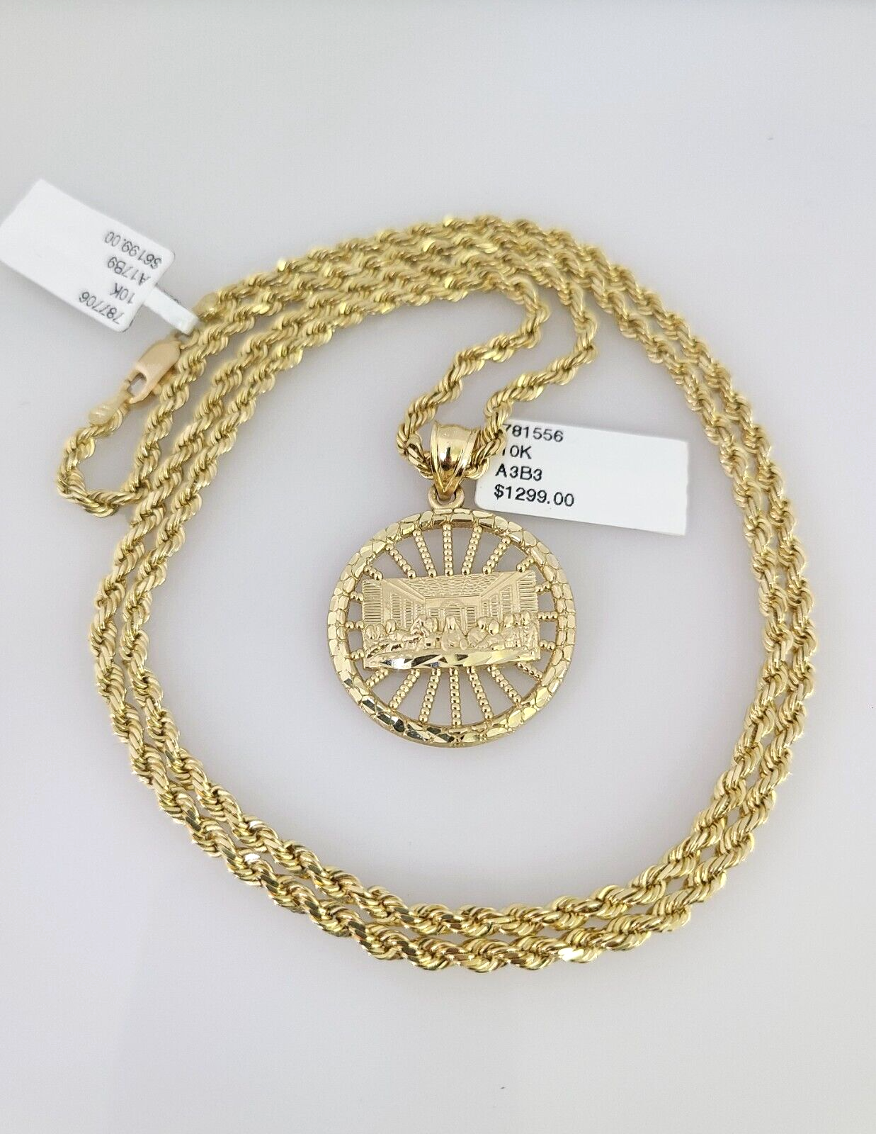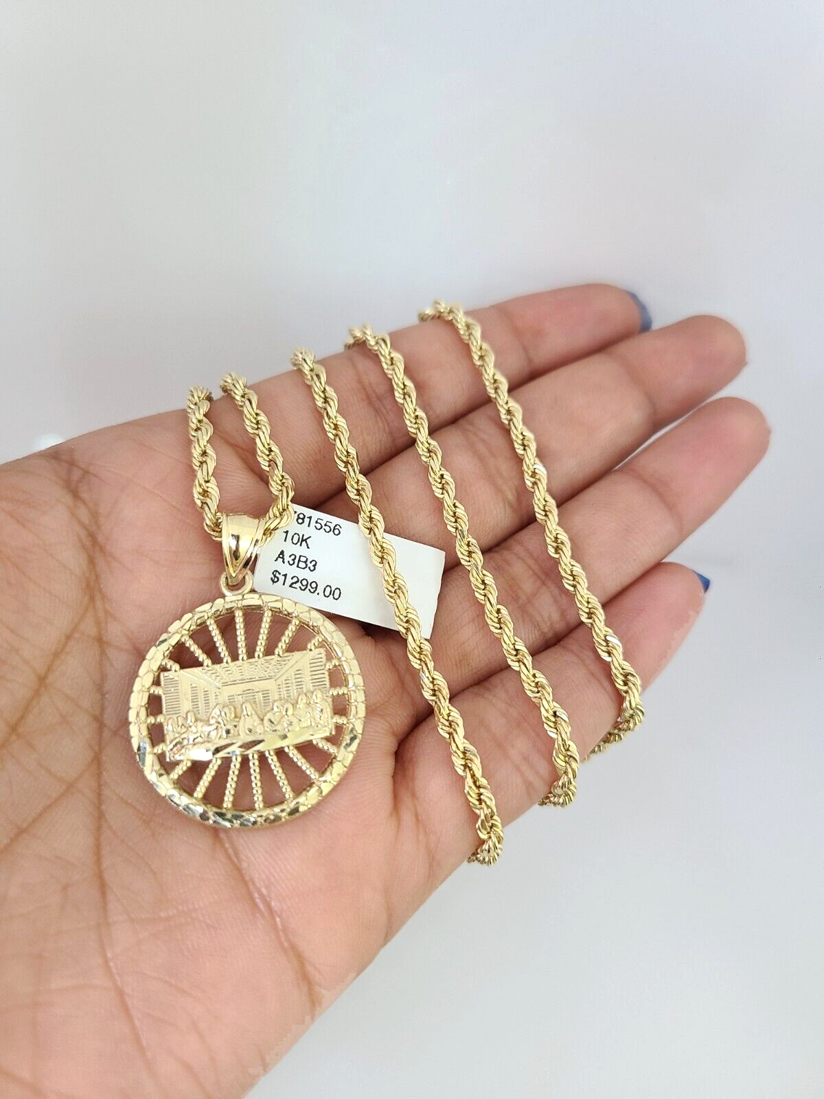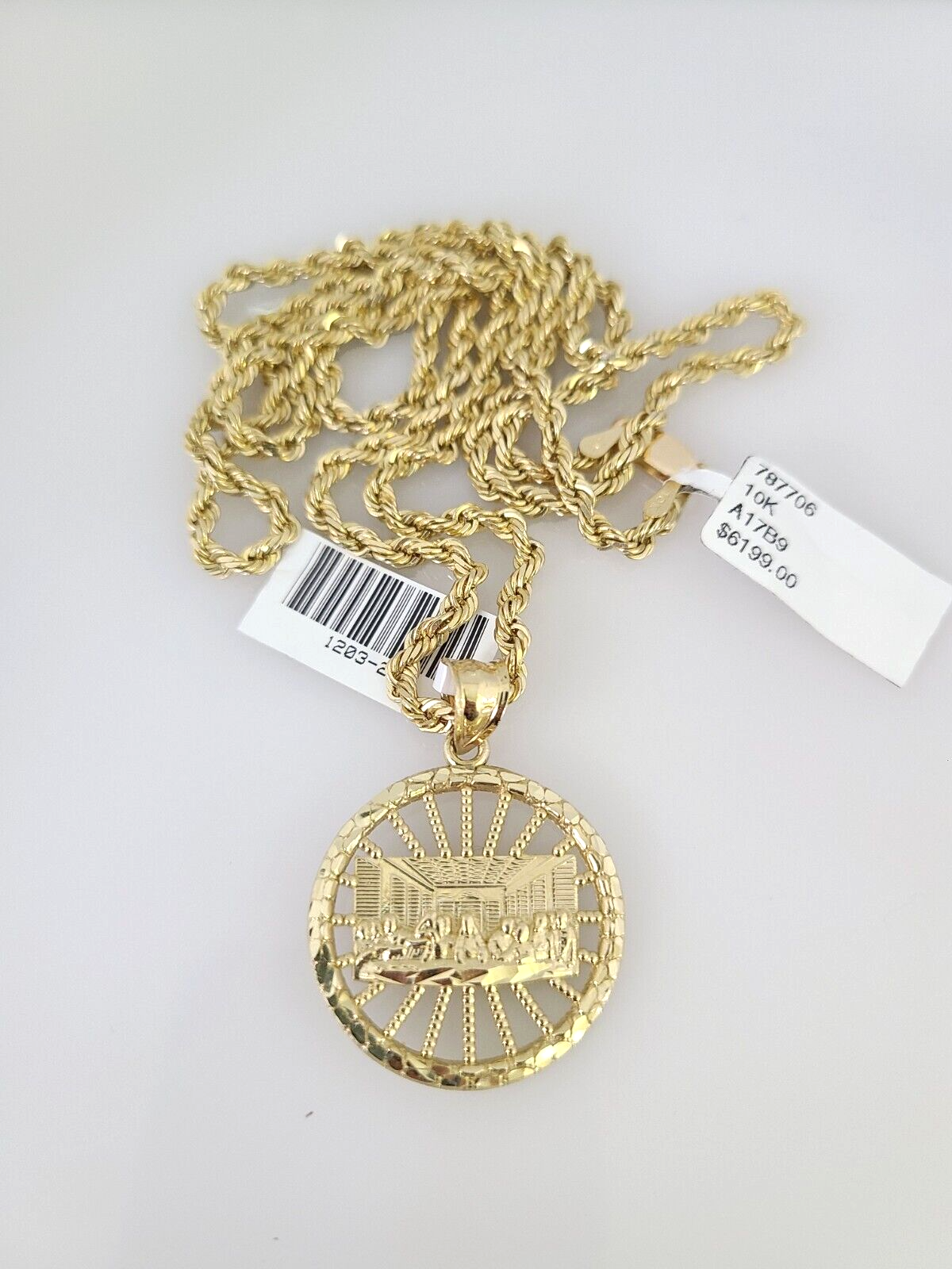 REAL 10k Rope Chain Last Supper Charm Pendant 3mm Necklace Set 18"-26"