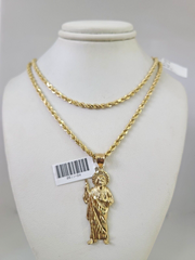 REAL 10k Solid Rope Chain Saint Jude Charm Pendant 3mm Set 18"-26" in Necklace - 18 Inch (Short Length)