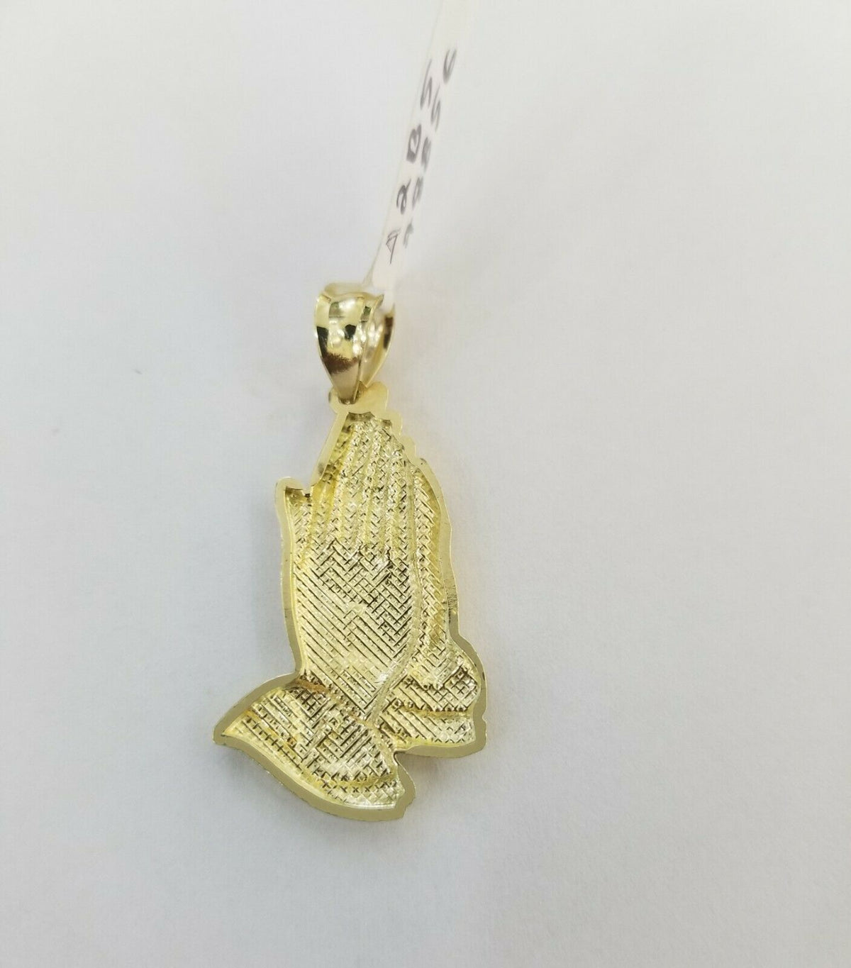 10 k Yellow Gold Real (Not plated , Not filled ) Rope chain Necklace 3mm 20" (short length) with 10k yellow gold praying hand charm pendant . The Length of the Pendant is 1.3 inches (approx. ) Long and 2.6-3 grams and chain weight is 4.5-5.5 Grams of approximate weight. The pendant can be worn with any chain. The pendant is considered durable. If you are not happy with the way it looks or feels, we do offer 30 - Days FREE Return shipping..