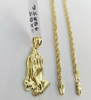 Real 10k Yellow Gold Chain & Charm Praying hand pendant , 22" 3mm Rope Necklace
