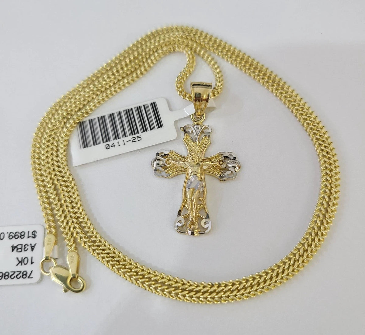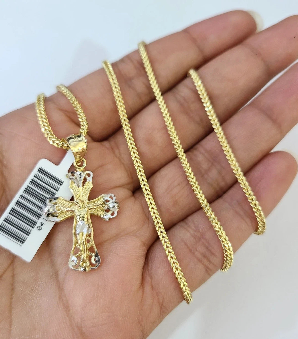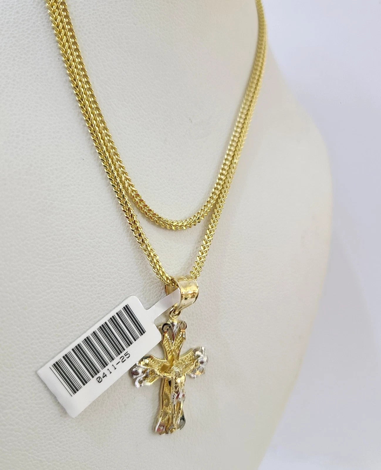 Is Presenting You with This Absolutely Stunning Real 10k Yellow Gold Franco Chain 2mm, 16"-28" with Jesus Cross Charm, Lobster Lock. The links are 10K GOLD and are very strong. These Beautiful Chains will not tarnish, discolor, or fade because they are Pure 10K Gold. We also have them in various another length. Please feel free to contact us if you have any queries regarding the item.