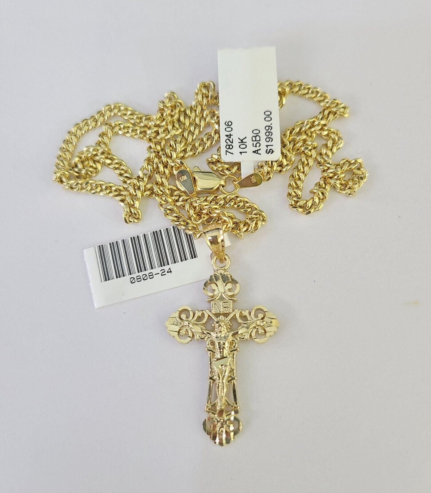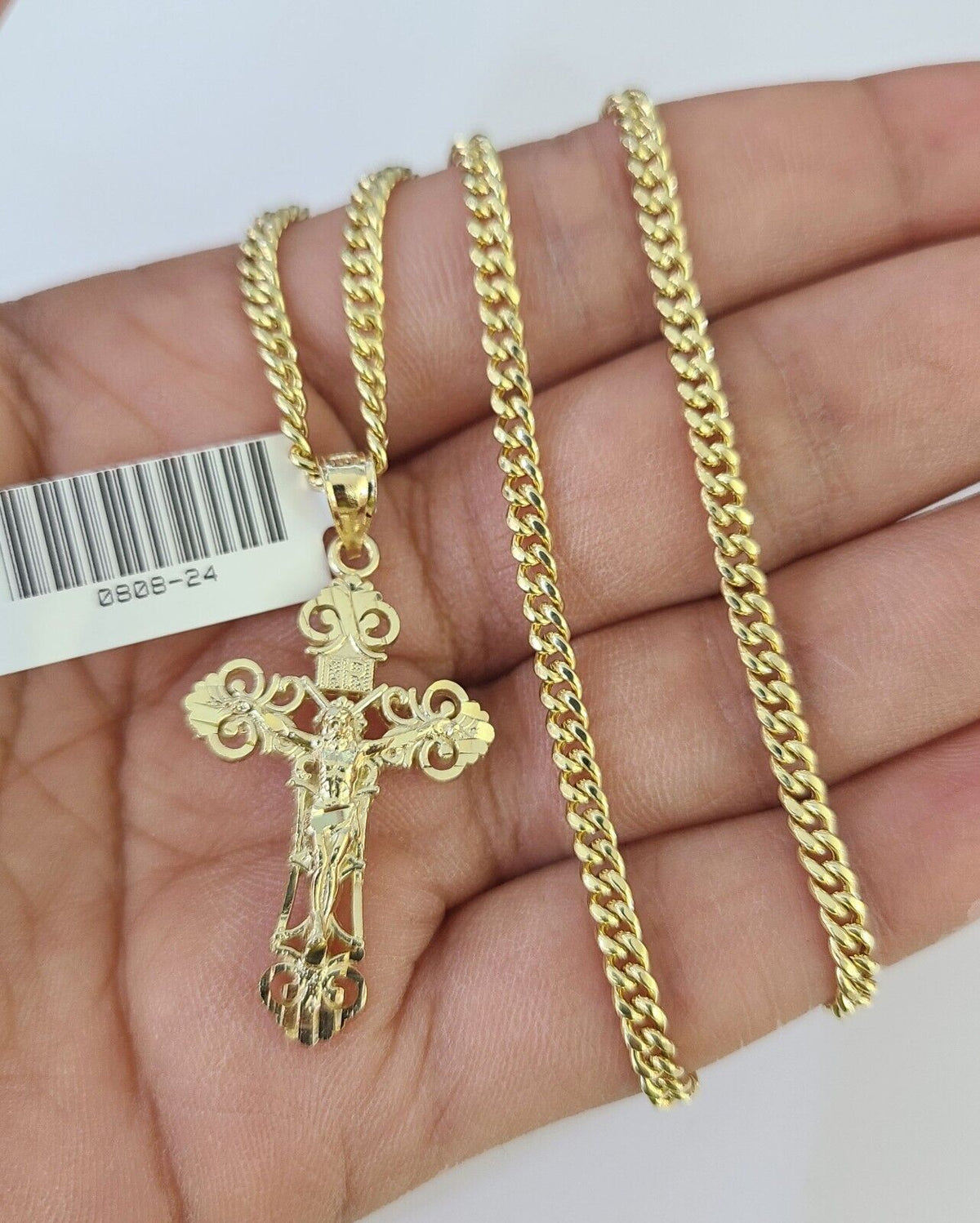 Is Presenting You with This Absolutely Stunning Real 10k Yellow Gold Miami Cuban Chain 3mm, 18"-28" with INRI Jesus Cross Charm, Lobster Lock. The links are 10K GOLD and are very strong. These Beautiful Chains will not tarnish, discolor, or fade because they are Pure 10K Gold. We also have them in various another length. Please feel free to contact us if you have any queries regarding the item. 20"-A5B0 A2B3