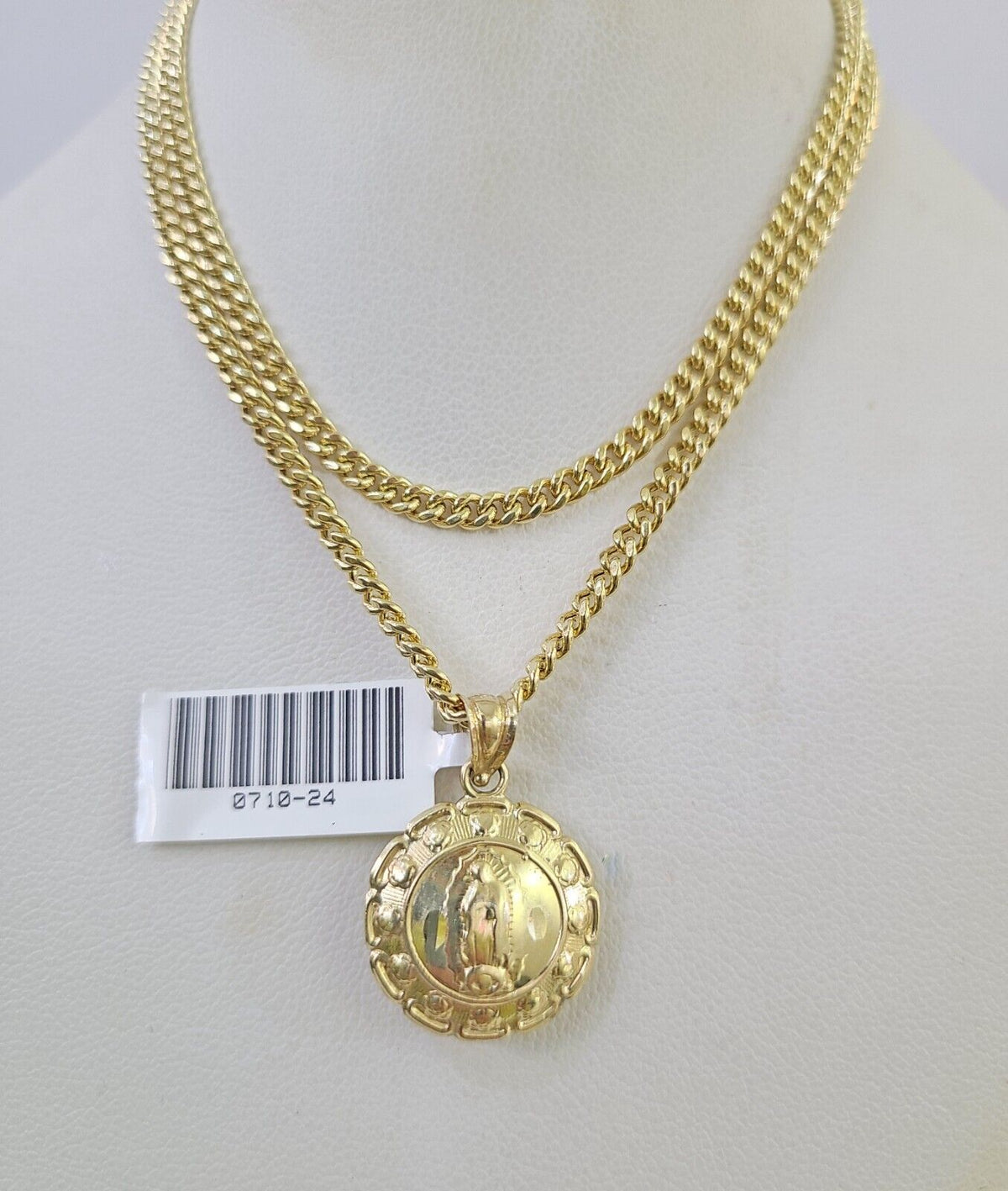 Is Presenting You with This Absolutely Stunning Real 10k Yellow Gold Miami Cuban Chain 3mm, 18"-28" with Jesus Head and Virgin Mary Charm, Lobster Lock. The links are 10K GOLD and are very strong. These Beautiful Chains will not tarnish, discolor, or fade because they are Pure 10K Gold. We also have them in various another length. Please feel free to contact us if you have any queries regarding the item. 20"-A5B0 A2B3