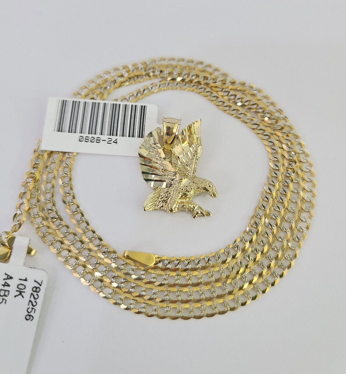 We present You with This Absolutely Stunning Real 10k Yellow Gold SOLID Cuban Curb link Chain Diamond Cuts with Flying Eagle Charm. It has a detailed cut with a very good finish. These Beautiful Chains will not tarnish, discolor, or fade because they are Pure 10K Gold. Please feel free to contact us if you have any queries regarding the item. 24"-A4B5 A1B8