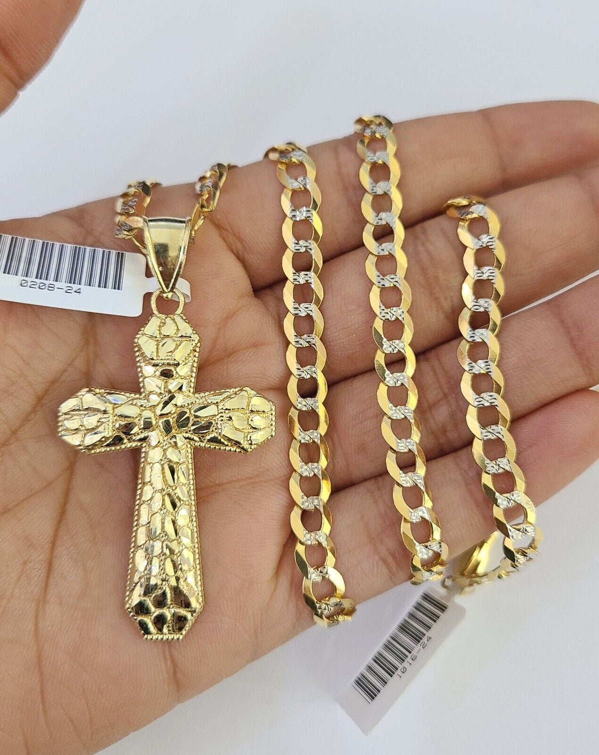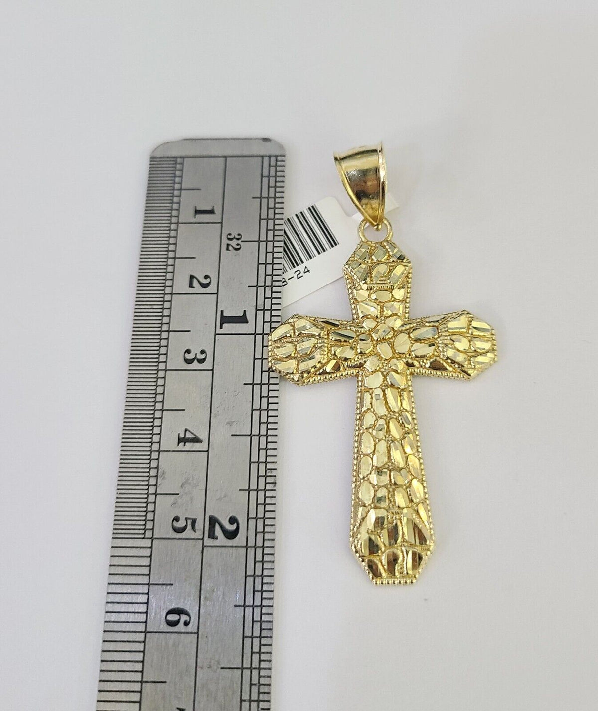 We present You with This Absolutely Stunning Real 10k Yellow Gold SOLID Cuban Curb link Chain Diamond Cuts with Jesus Cross Charm. It has a detailed cut with a very good finish. These Beautiful Chains will not tarnish, discolor, or fade because they are Pure 10K Gold. Please feel free to contact us if you have any queries regarding the item. 24"-A17B8 A4B4