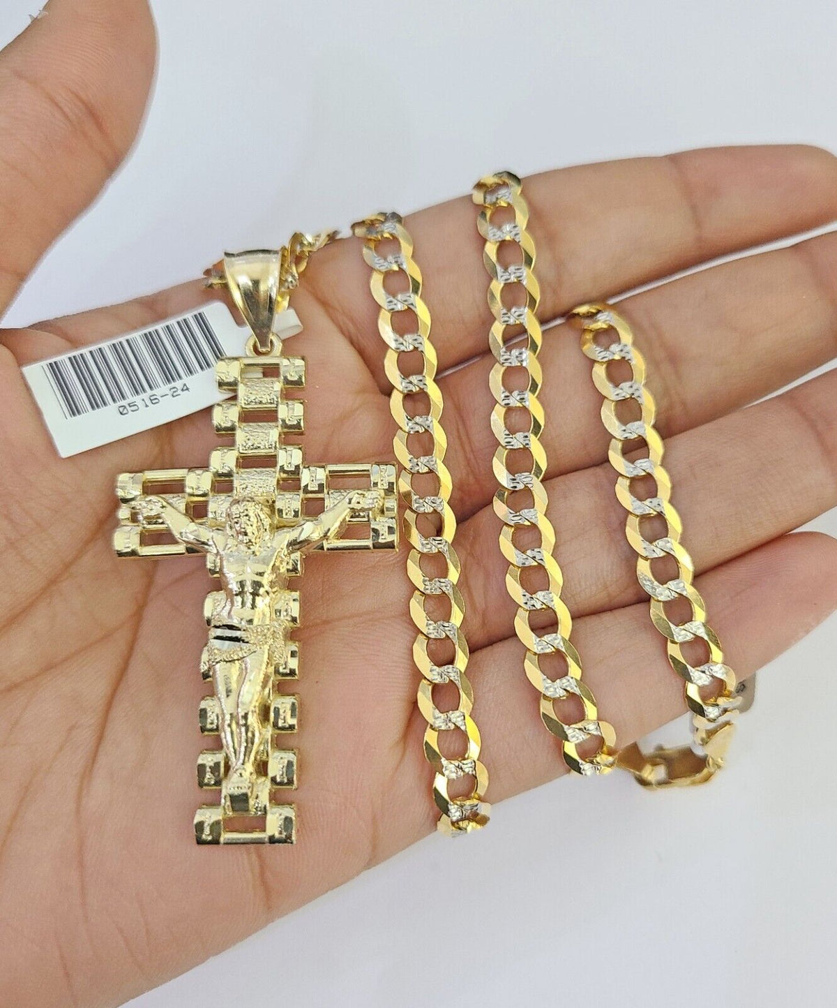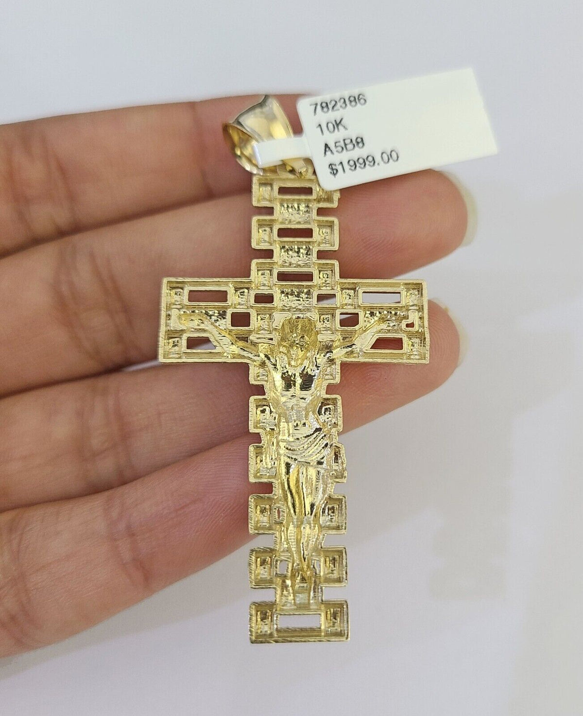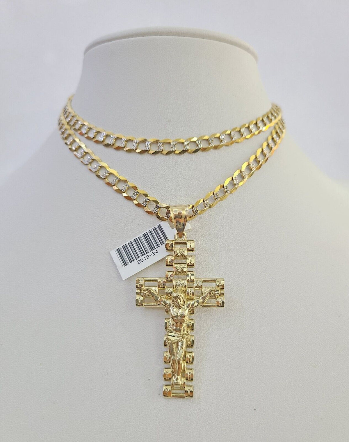 We present You with This Absolutely Stunning Real 10k Yellow Gold SOLID Cuban Curb link Chain Diamond Cuts with Jesus Cross Charm. It has a detailed cut with a very good finish. These Beautiful Chains will not tarnish, discolor, or fade because they are Pure 10K Gold. Please feel free to contact us if you have any queries regarding the item. 24"-A17B8 A5B8