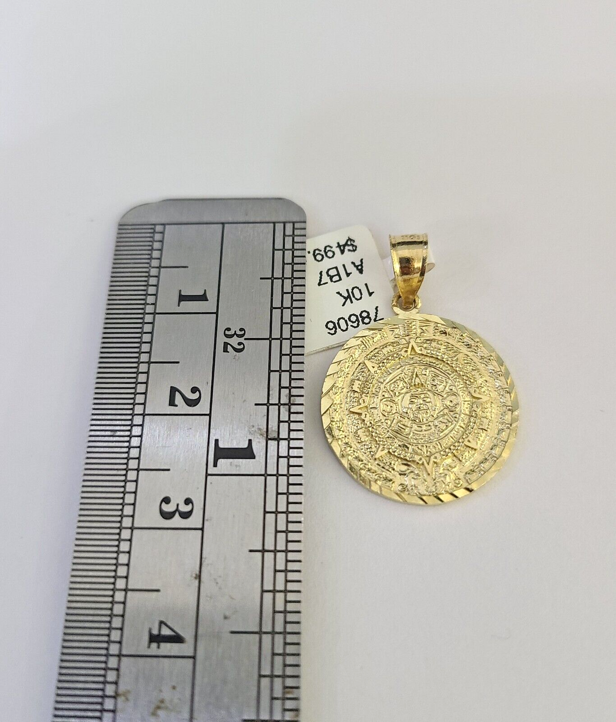 We present You with This Absolutely Stunning Real 10k Yellow Gold SOLID Cuban Curb link Chain Diamond Cuts with Mayan Calendar Charm. It has a detailed cut with a very good finish. These Beautiful Chains will not tarnish, discolor, or fade because they are Pure 10K Gold. Please feel free to contact us if you have any queries regarding the item. 24"-A4B5 A1B7 Cal