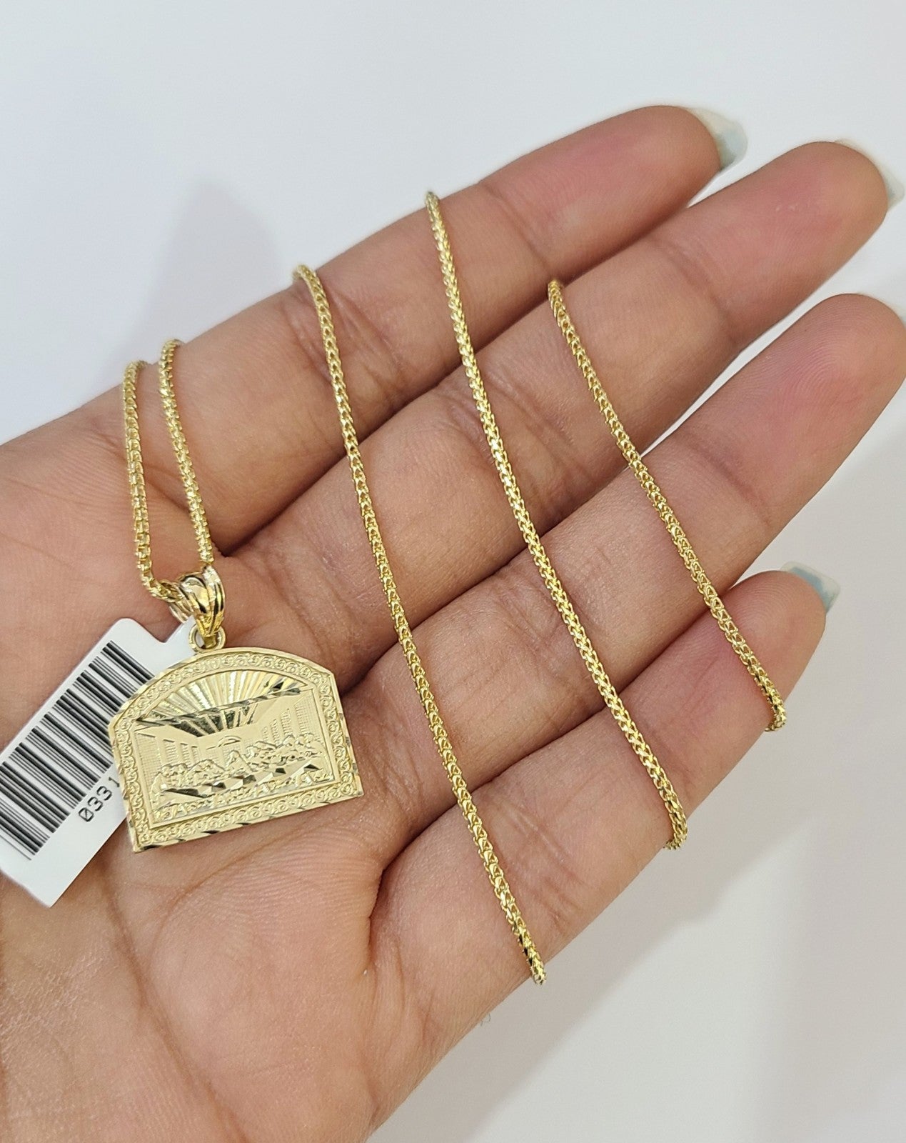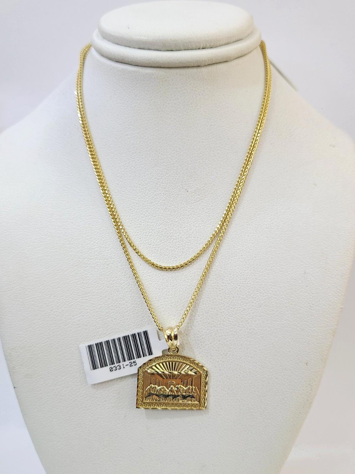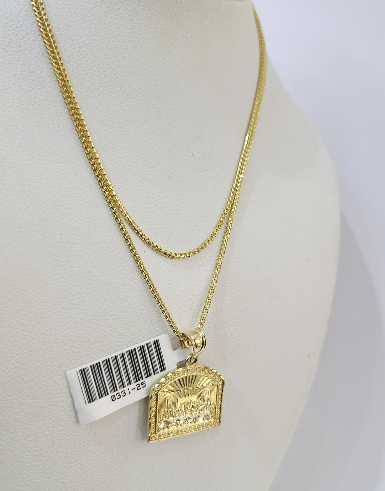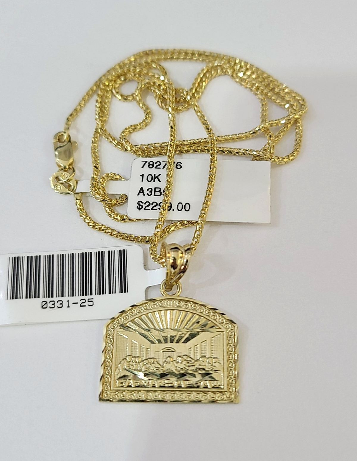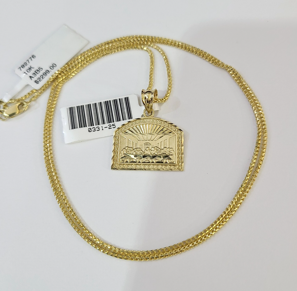 10kt Yellow Gold Franco Chain Necklace Last Supper Charm Pendant 1mm 16-22 inches