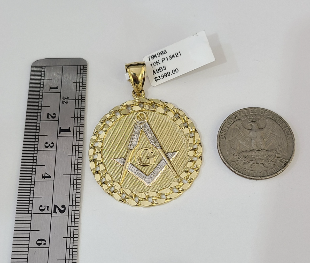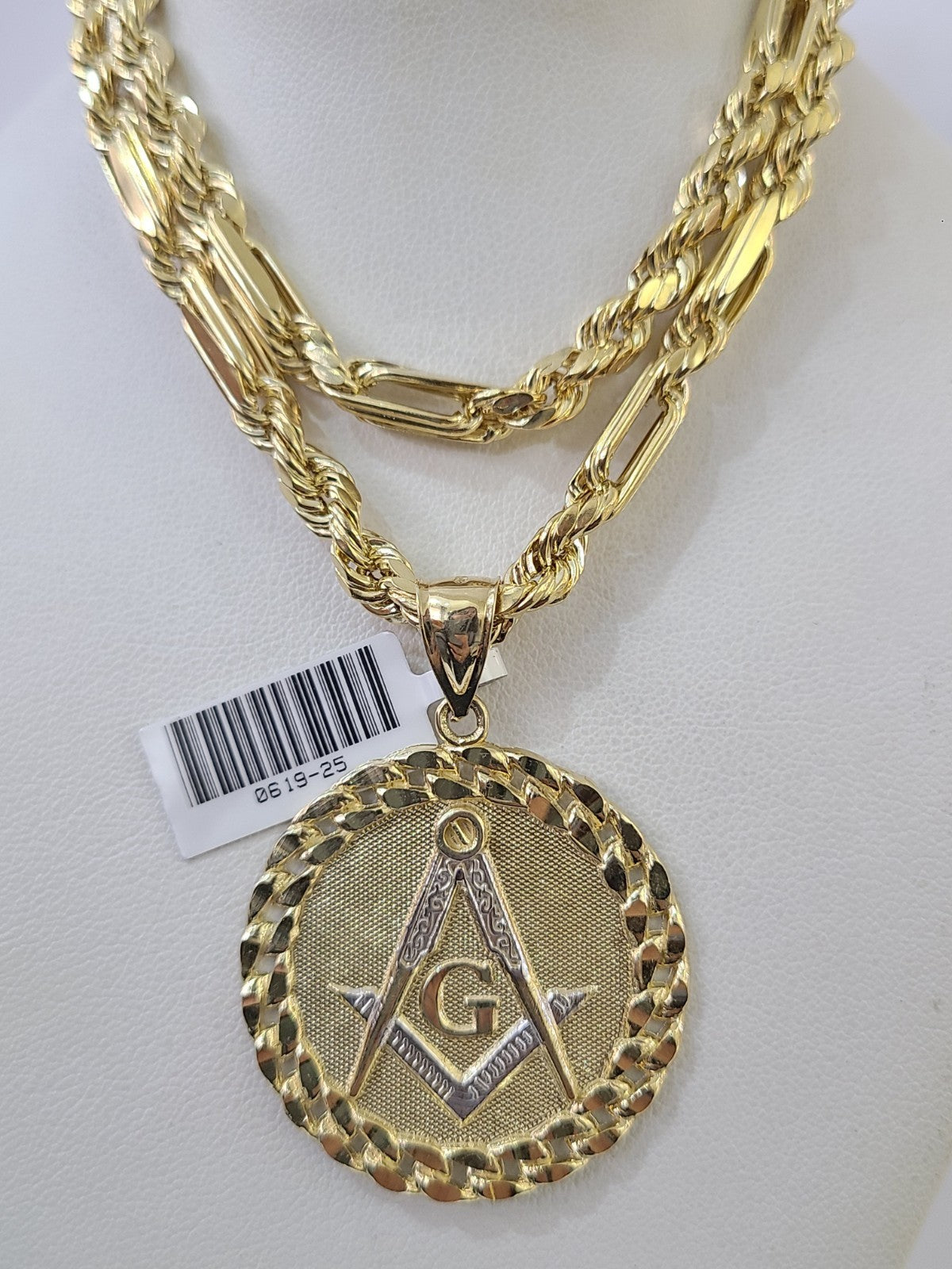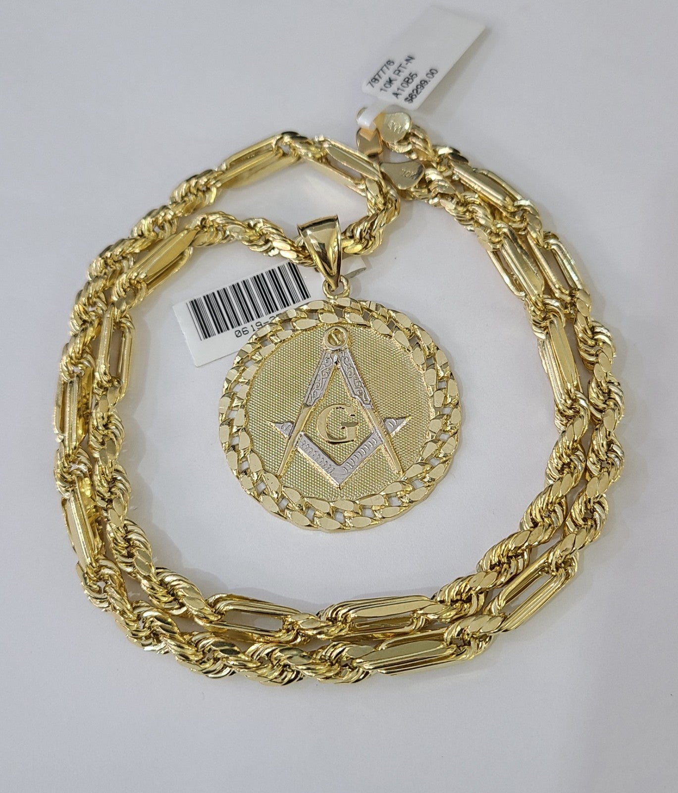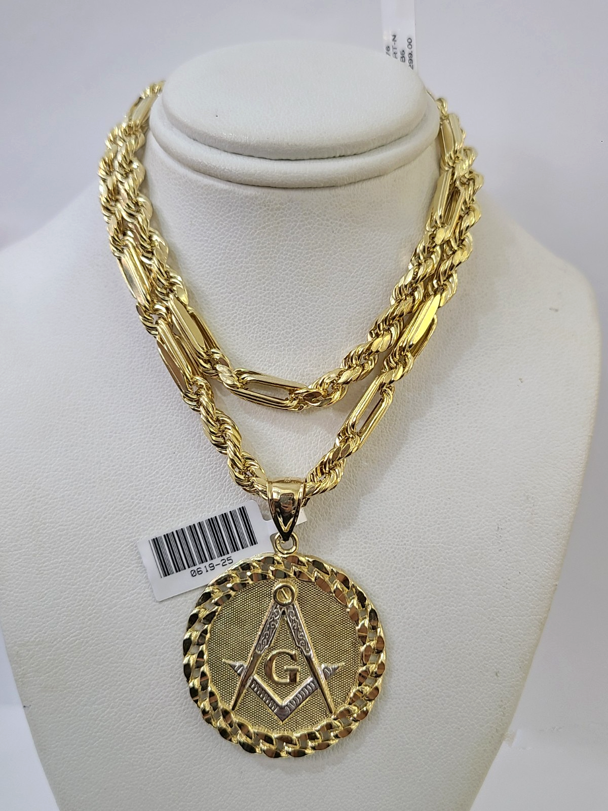 Genuine 10k Yellow Gold Milano Chain 18-28 inches 5mm Necklace with Masonic design as a SET. The Various length of the Chain are 18-28 inches. If you are not happy with the way it looks or feels, we do offer 30 - Days FREE Return shipping. Contact us for more information.