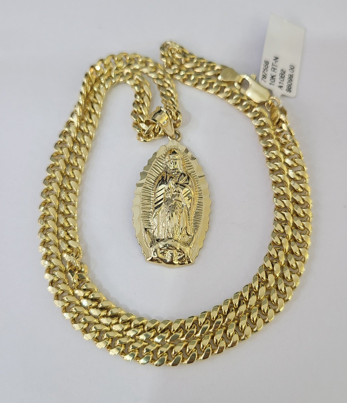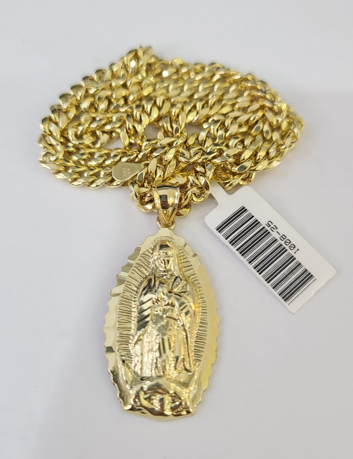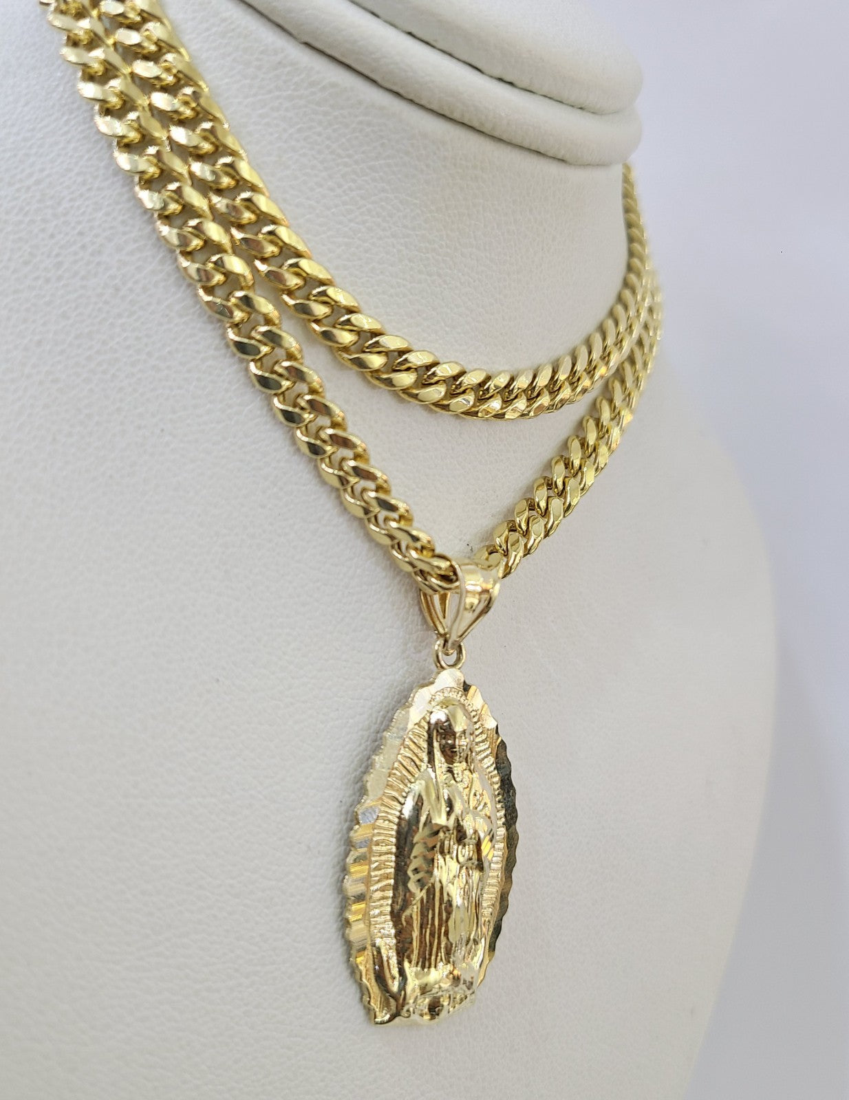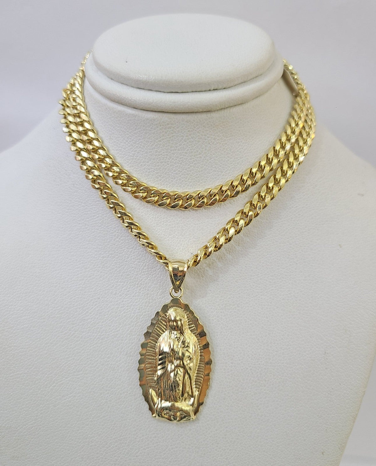 10k Gold Chain Miami Cuban Virgin Mary Charm Pendant Set 4mm 18"-28" Necklace - 20 Inch