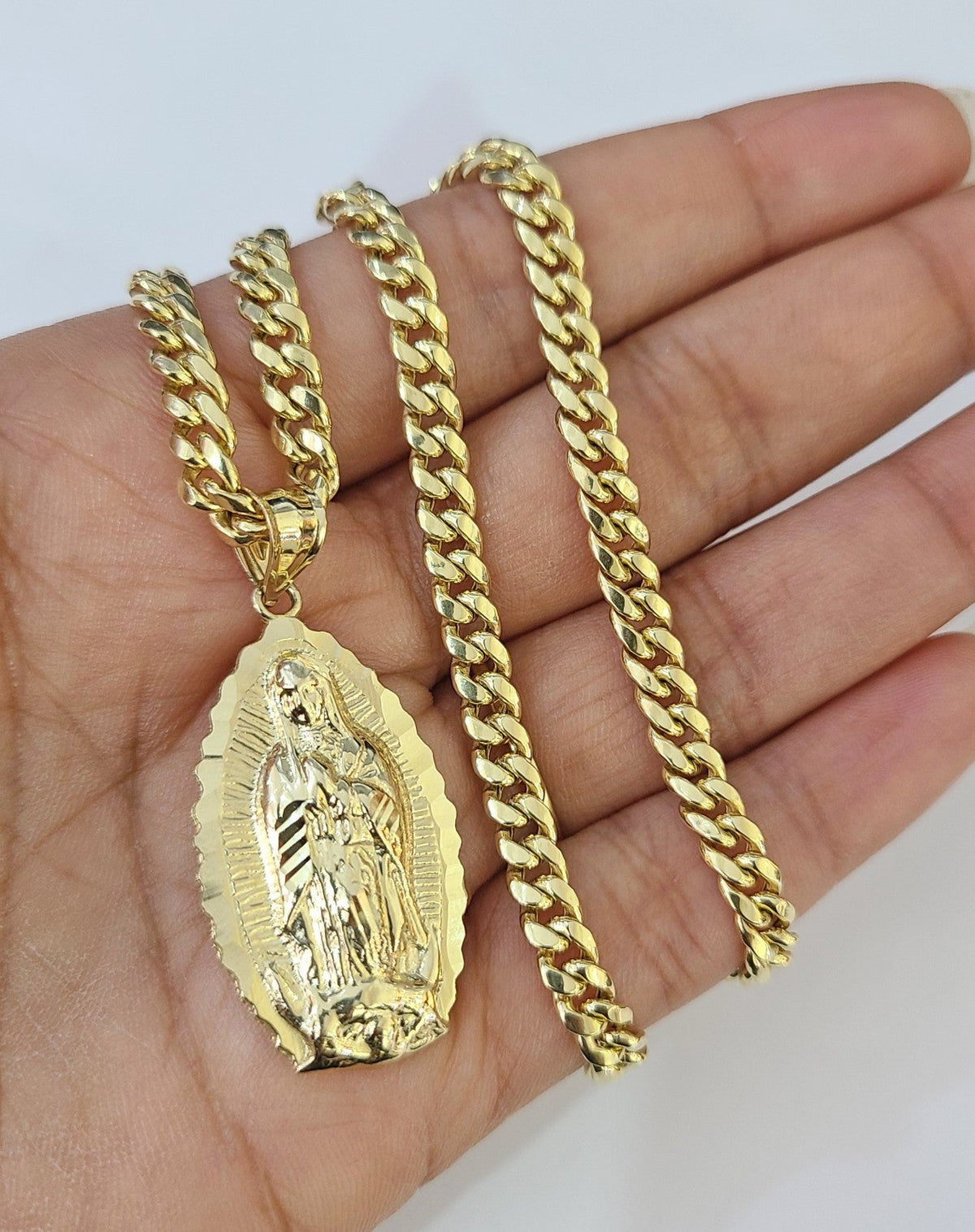 10k Gold Chain Miami Cuban Virgin Mary Charm Pendant Set 4mm 18"-28" Necklace