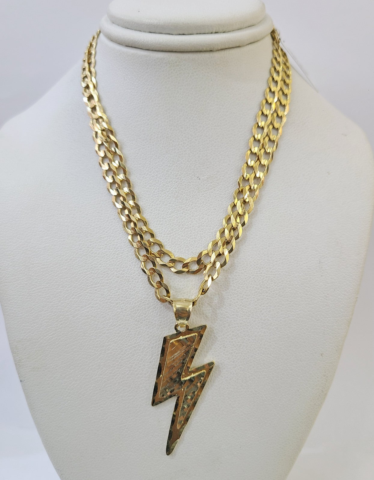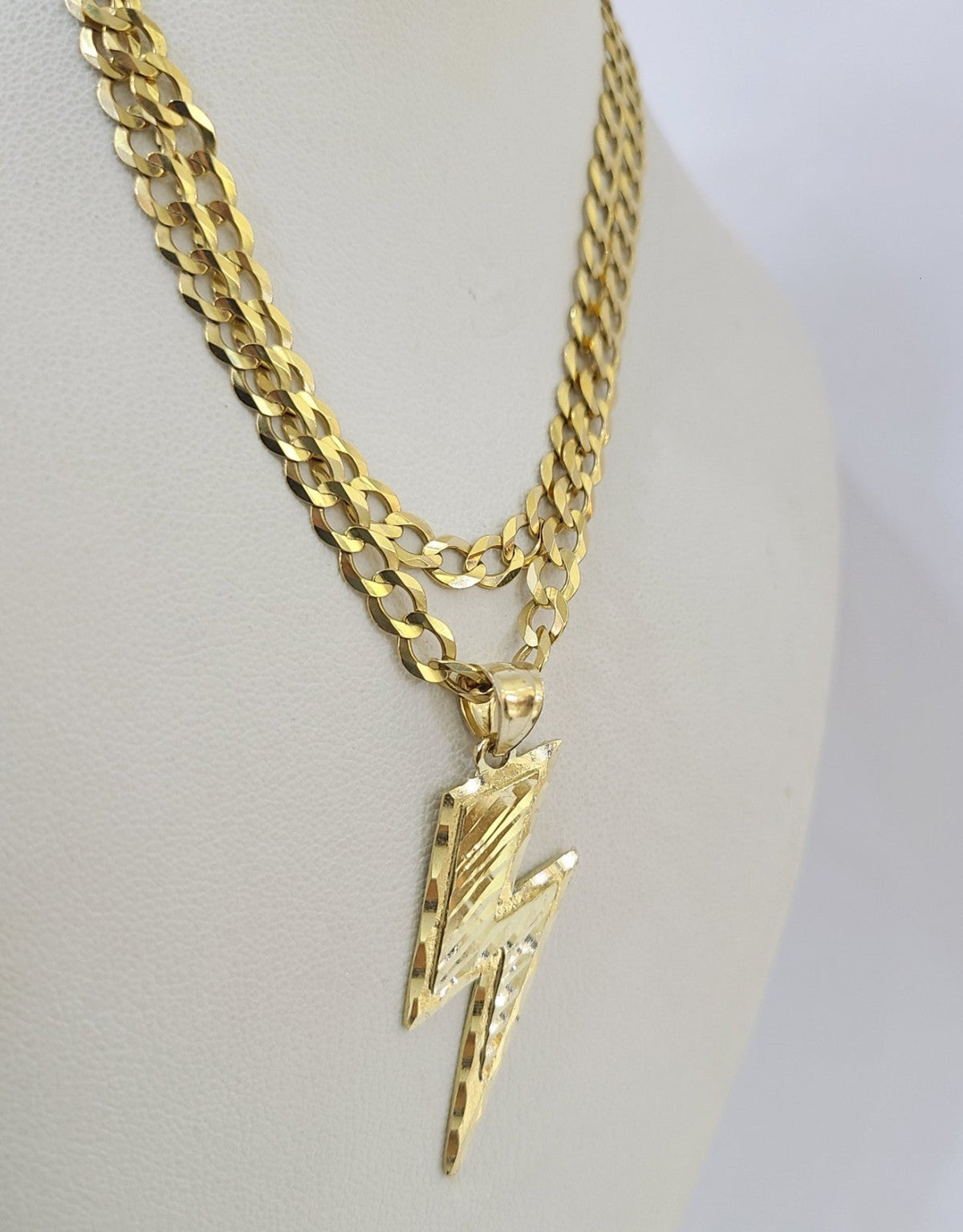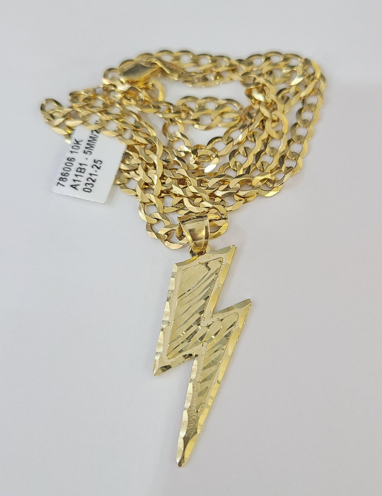 10k Gold Chain Necklace Lightning Bolt Pendant Set Cuban Curb 5mm 18"-28" Charm