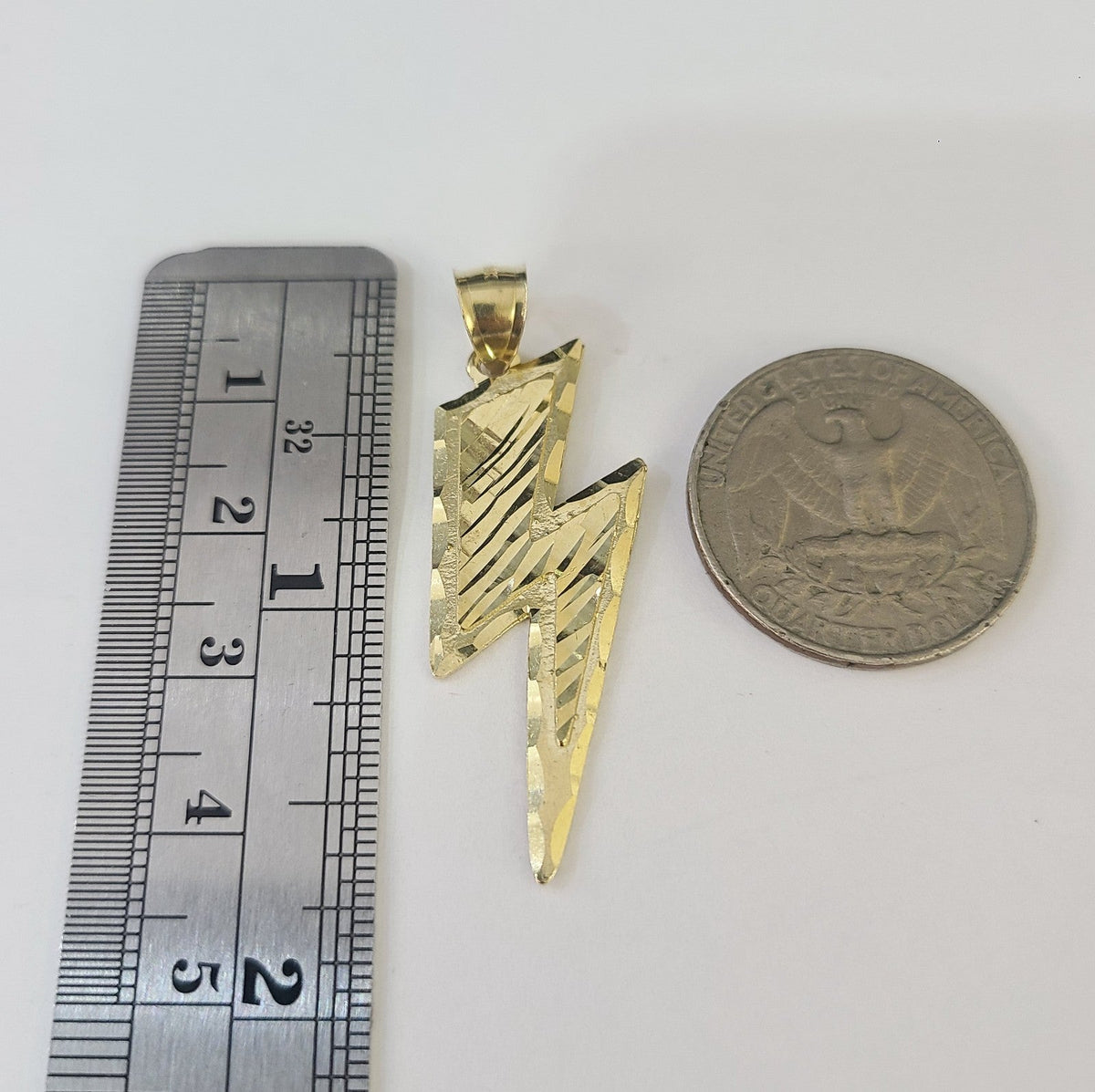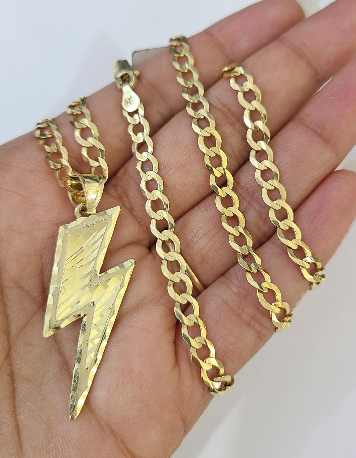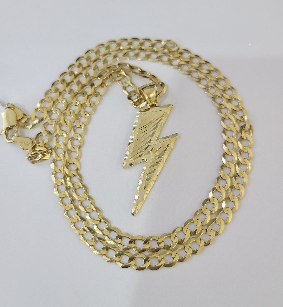 10k Gold Chain Necklace Lightning Bolt Pendant Set Cuban Curb 5mm 18"-28" Charm