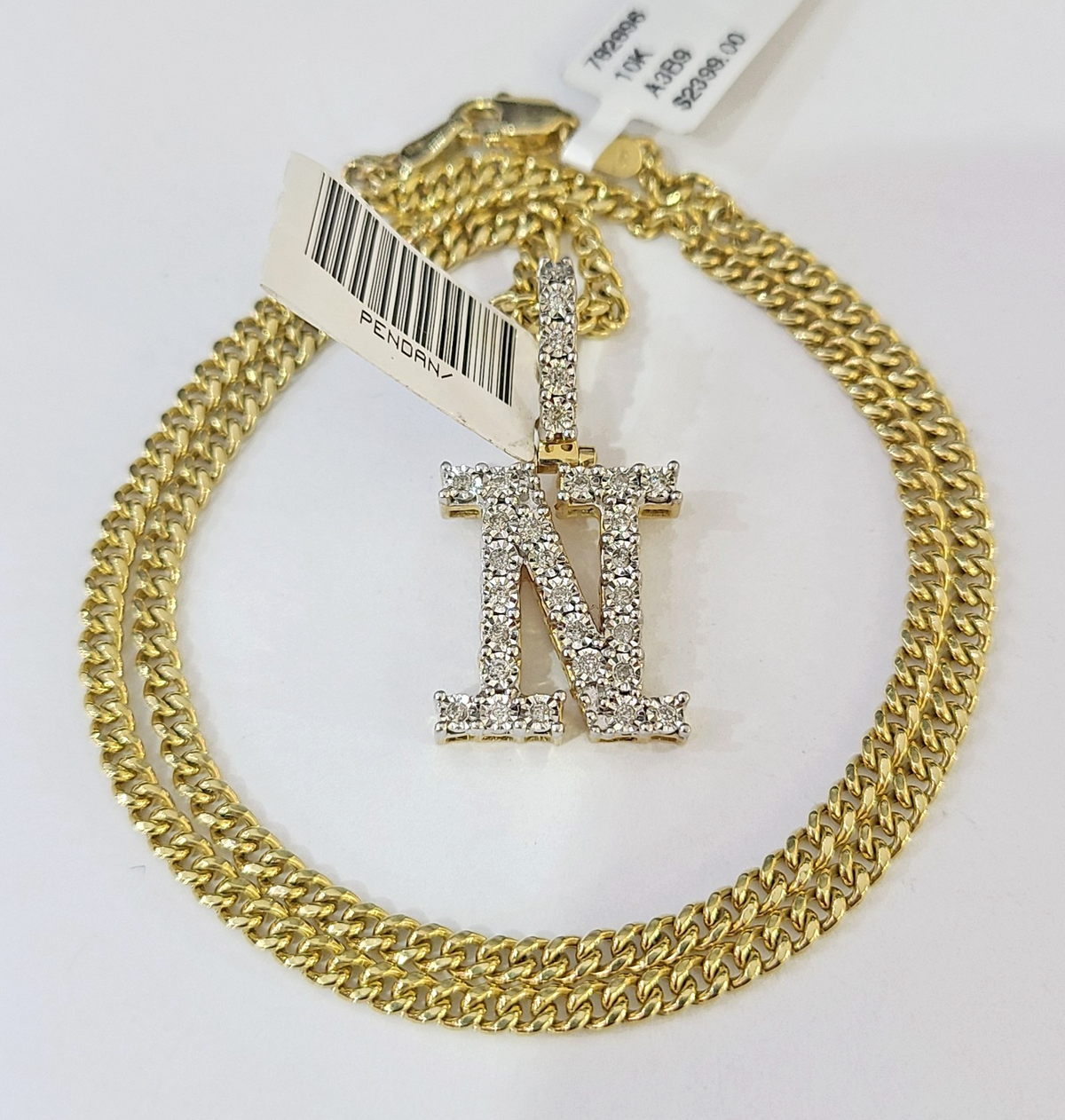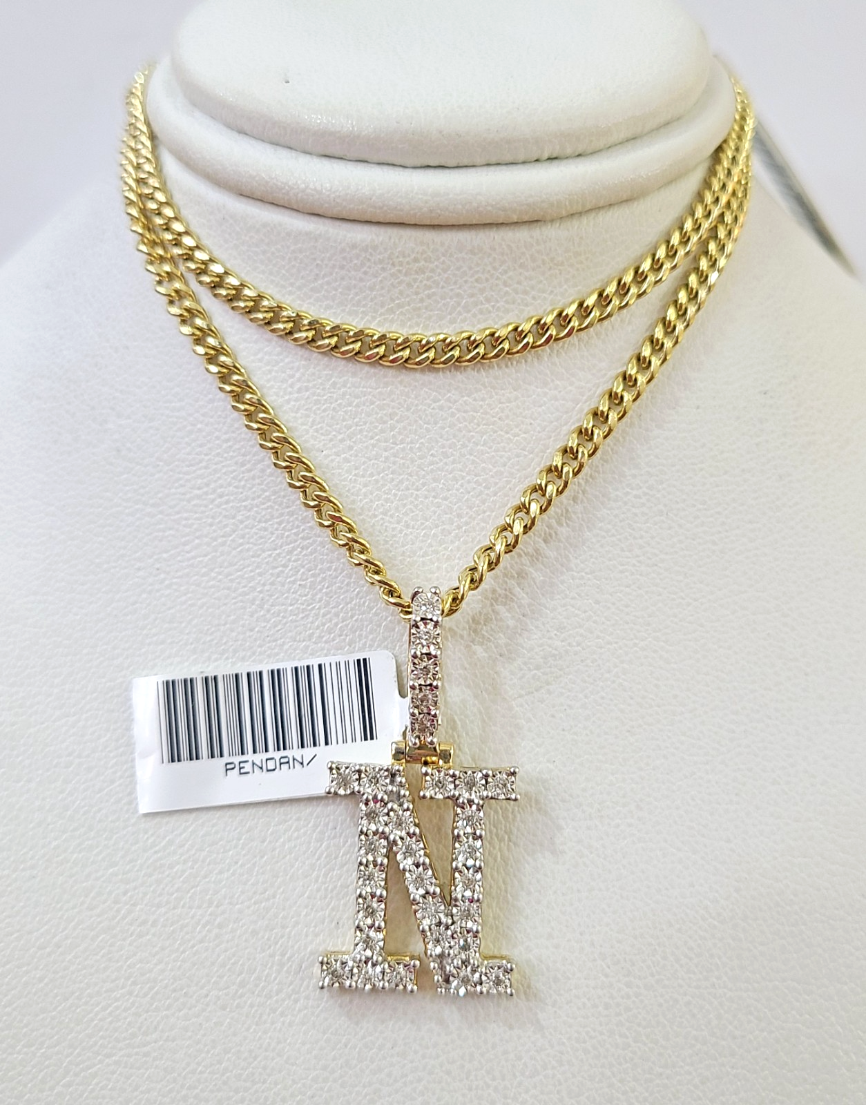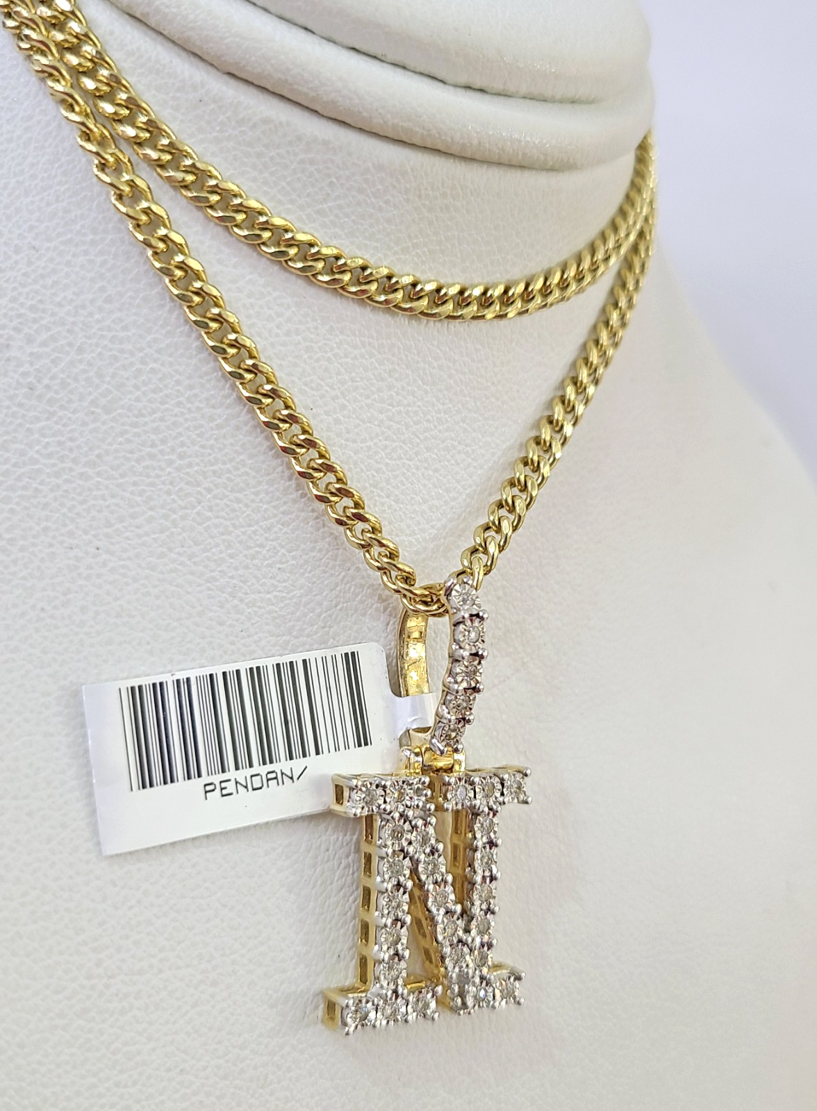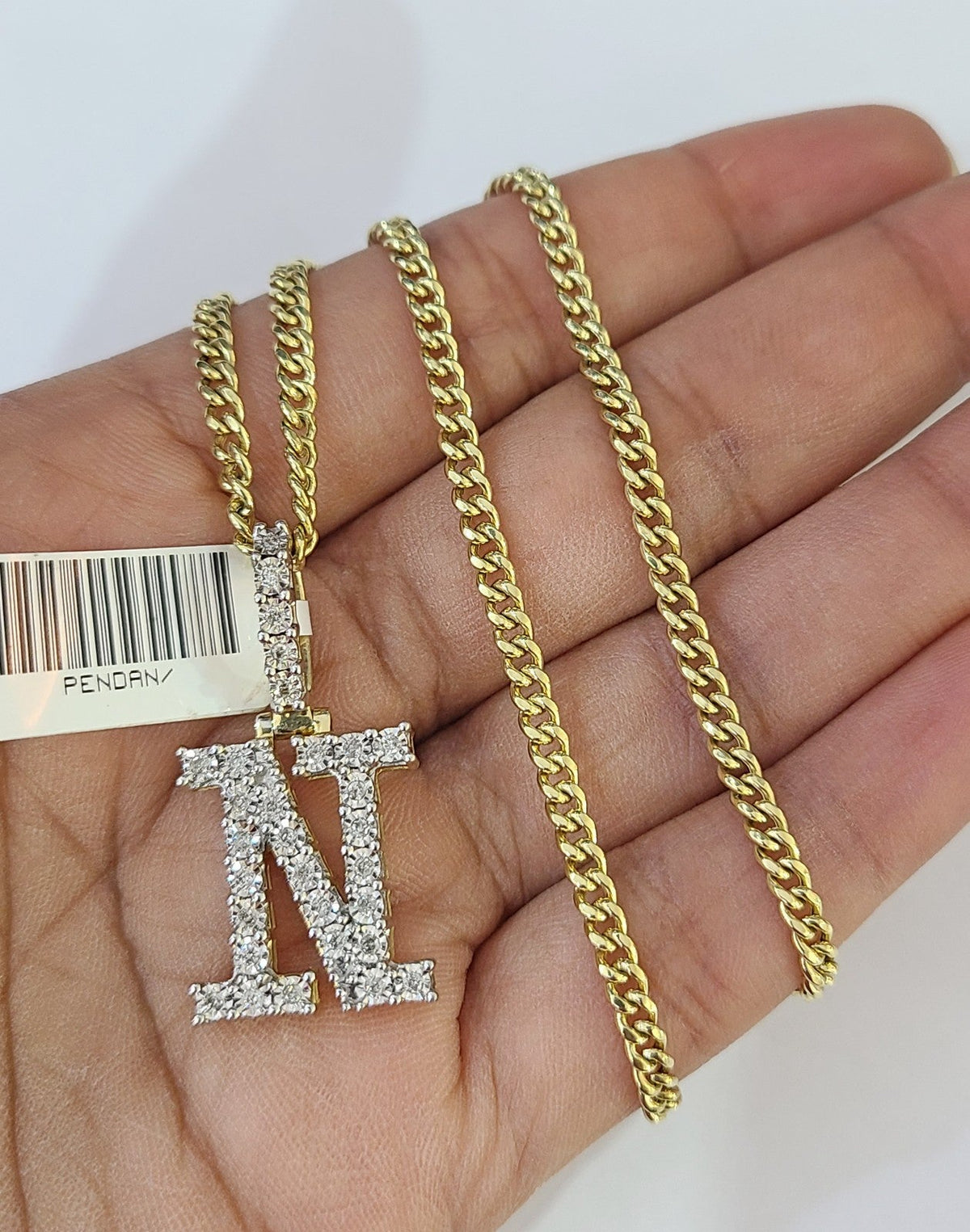 10K Gold Miami Cuban Chain N Diamond Initial 18"-24" 2mm Pendant Necklace SET - 20 Inch with Chain