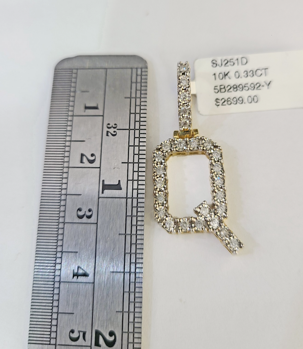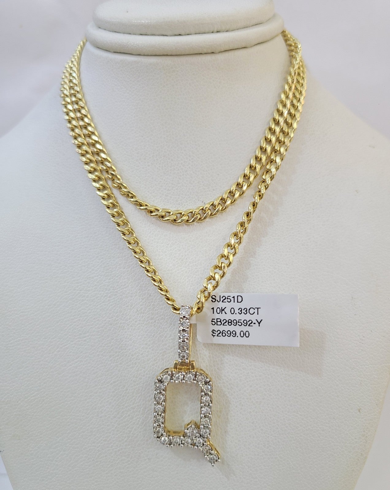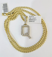 10K Gold Miami Cuban Chain Q Diamond Initial 18"-24" 2mm Pendant Necklace SET