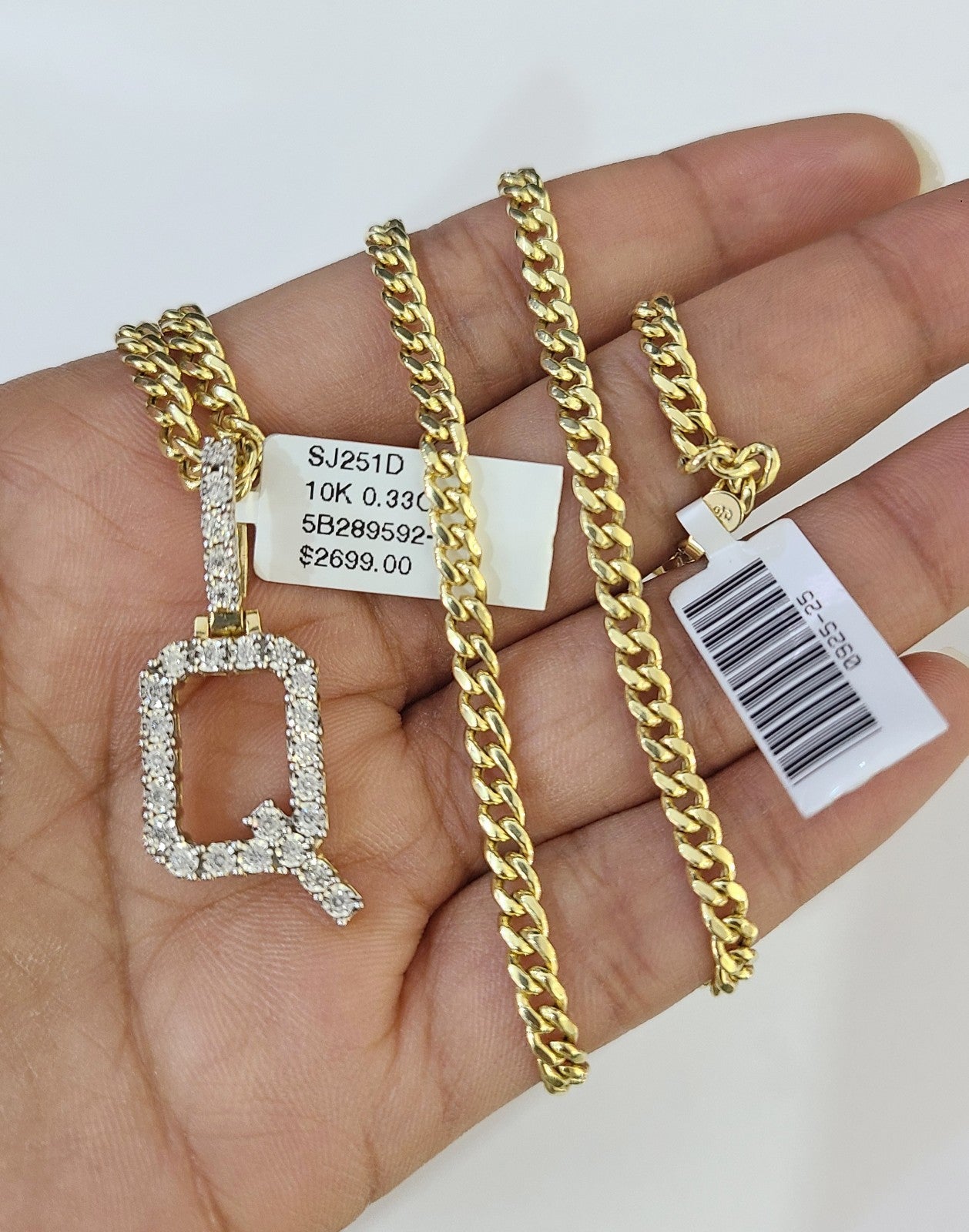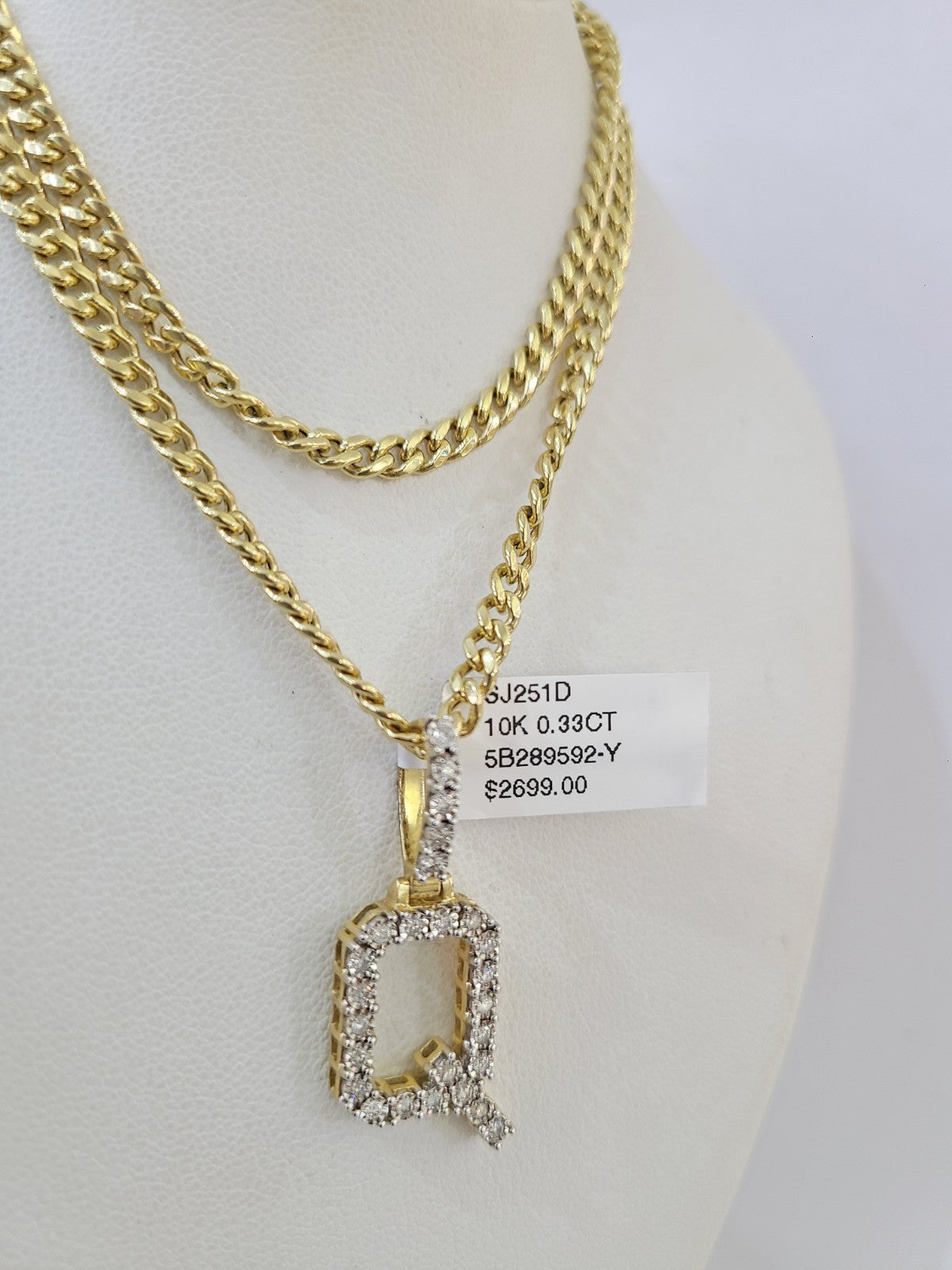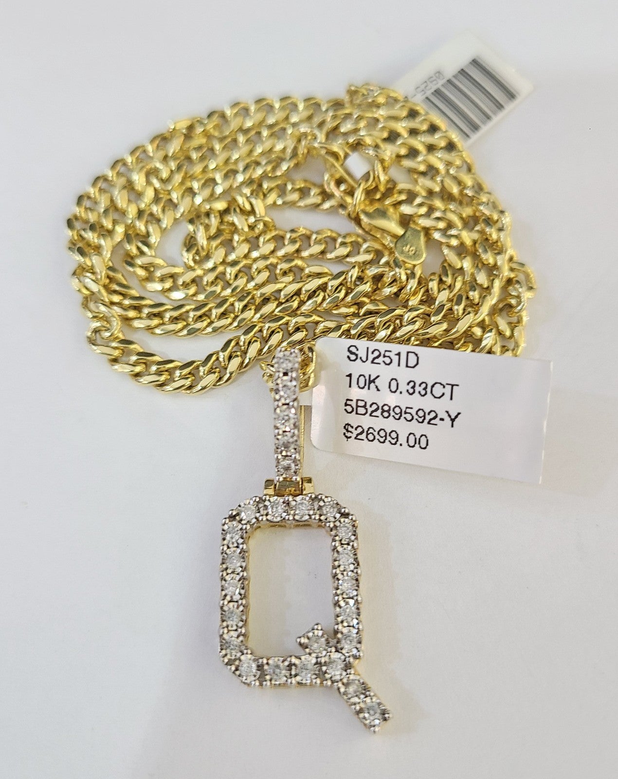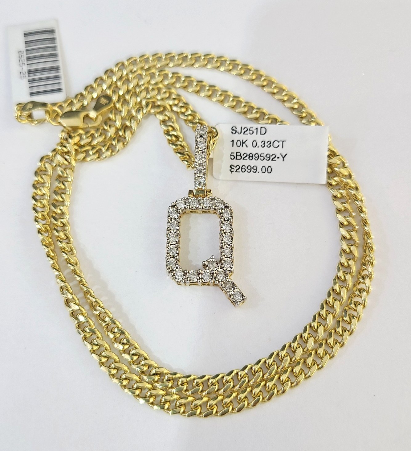 10K Gold Miami Cuban Chain Q Diamond Initial 18"-24" 2mm Pendant Necklace SET - 20 Inch with Chain