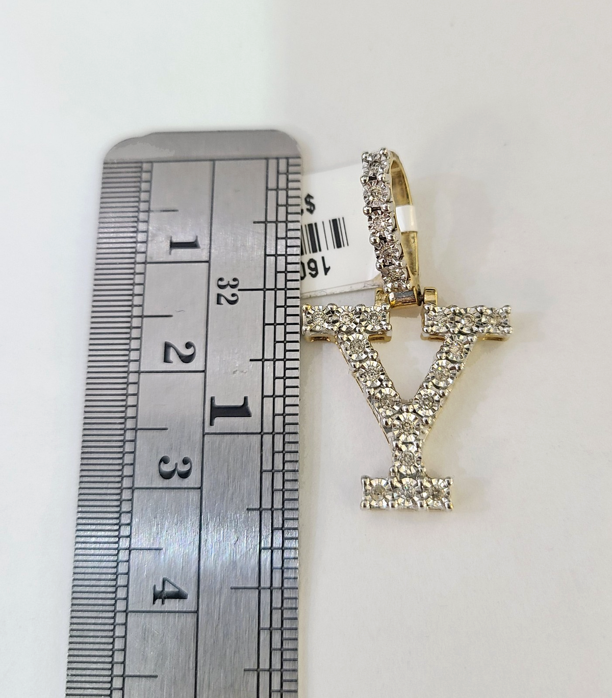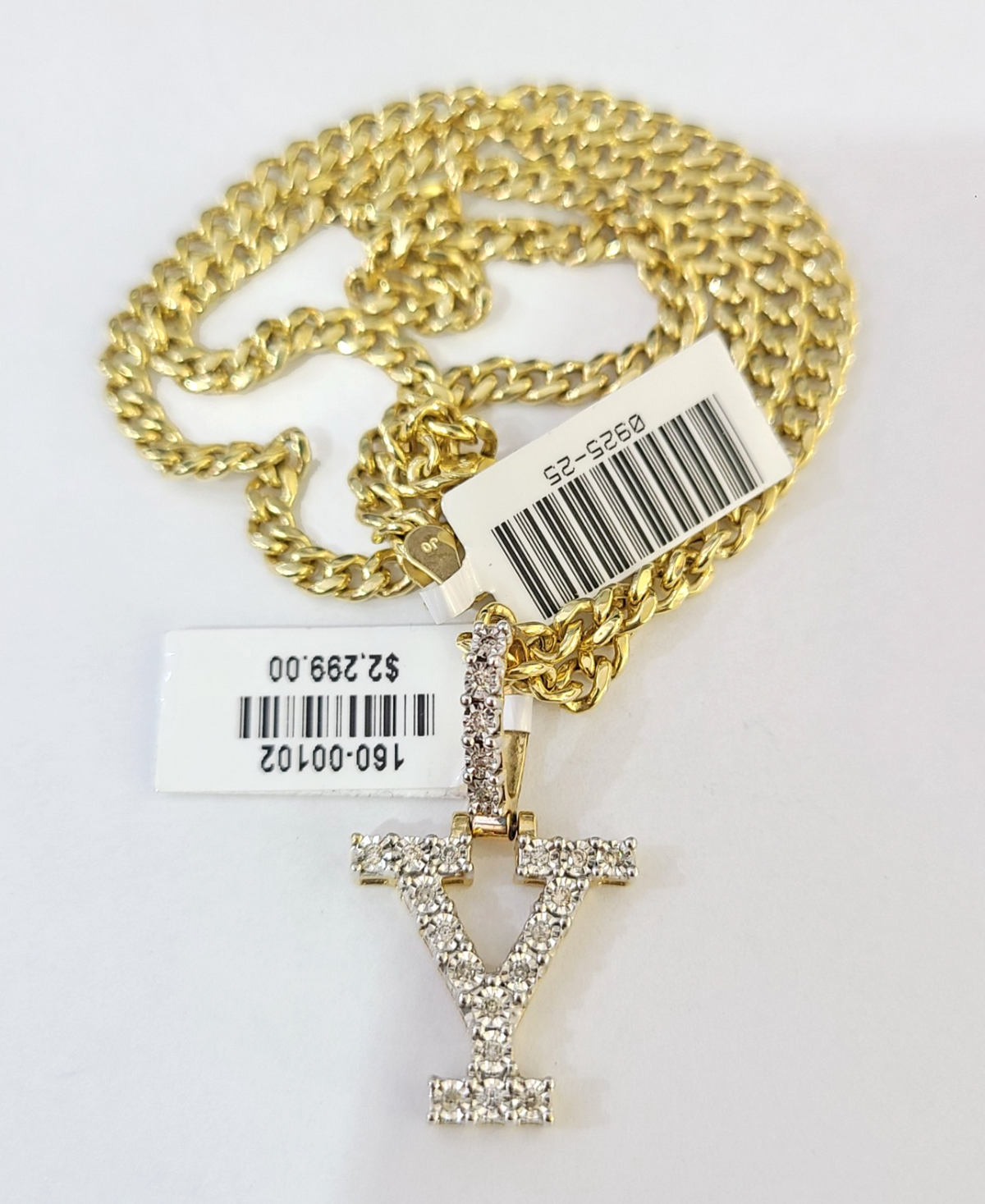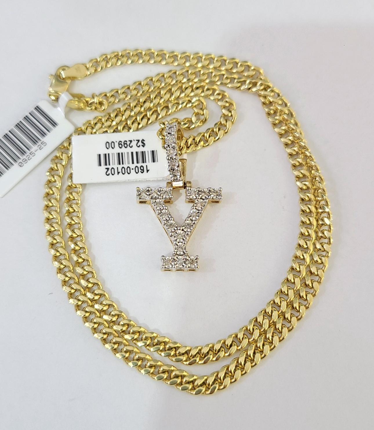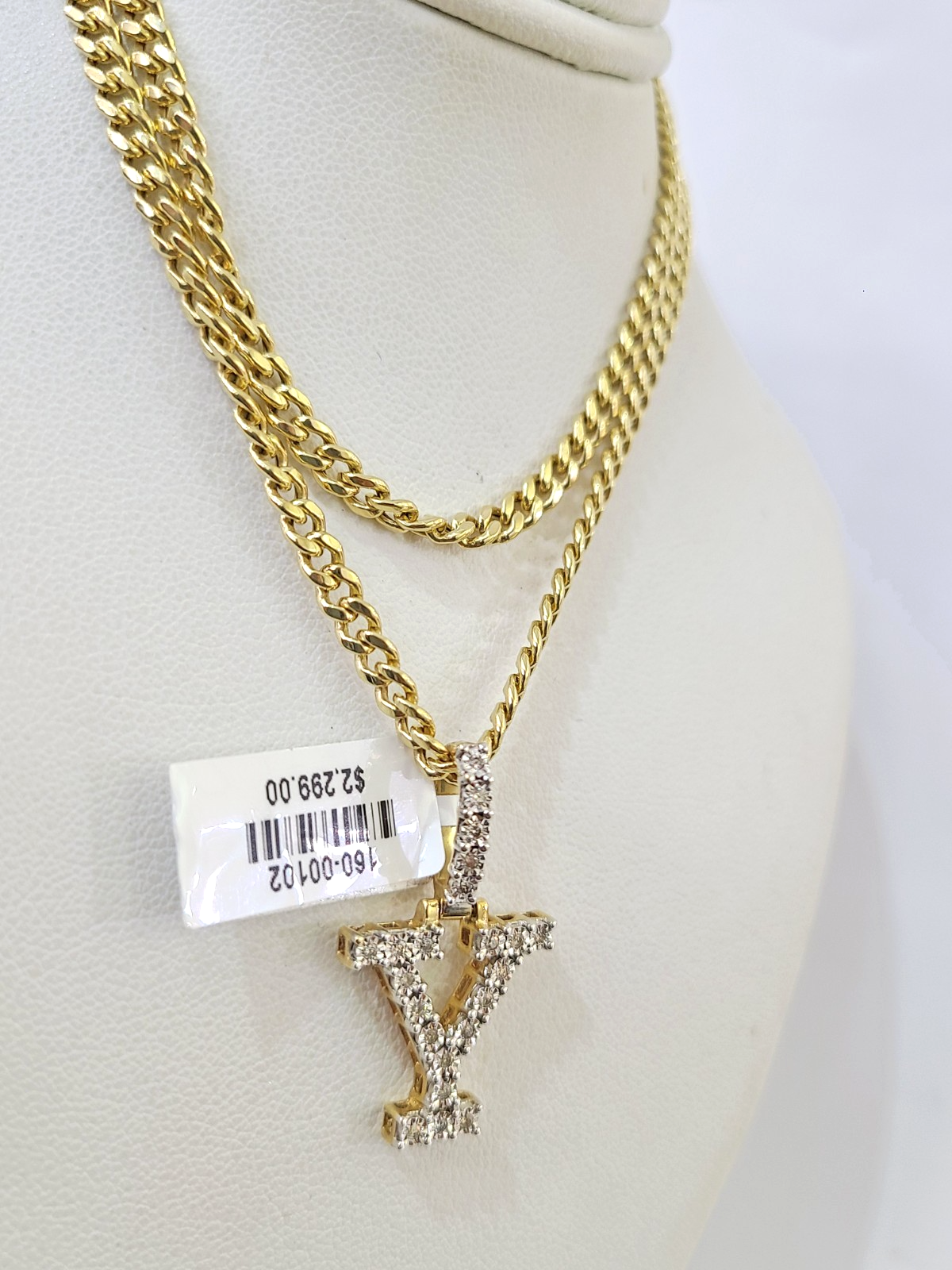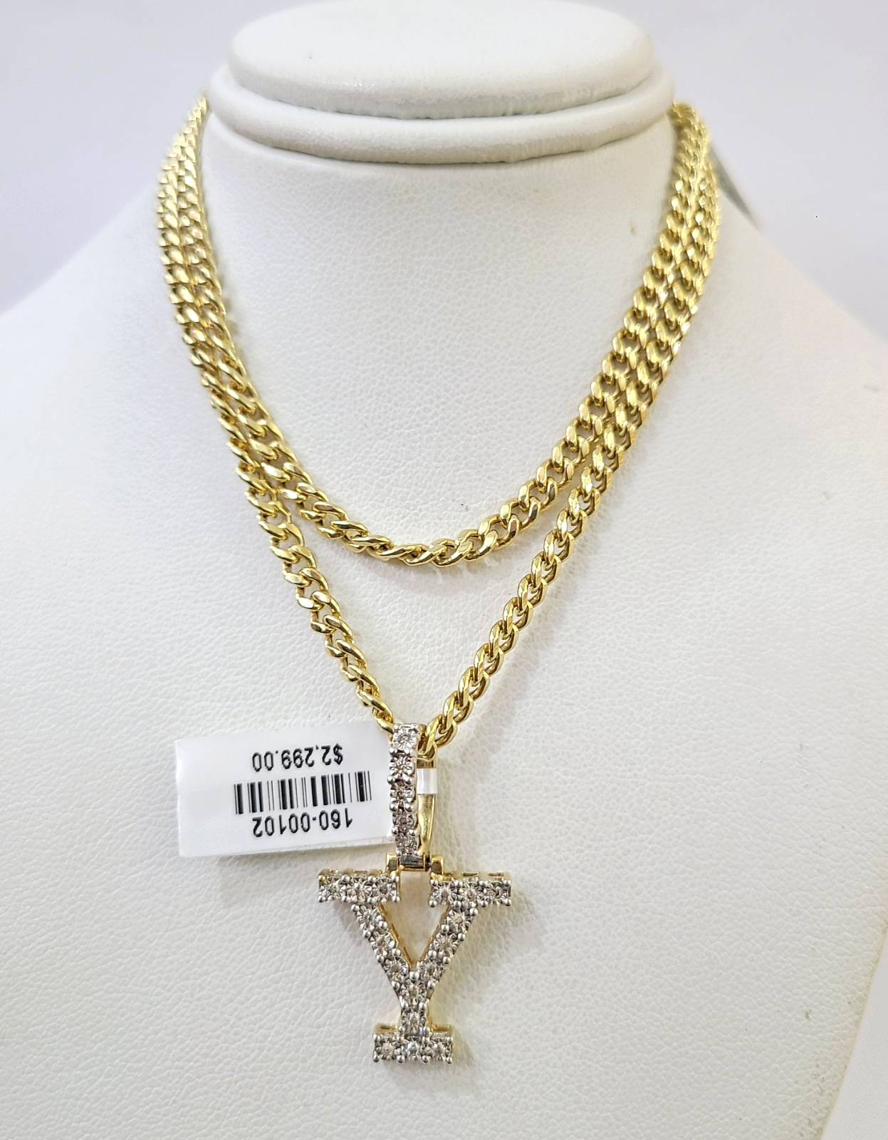 10K Gold Miami Cuban Chain Y Diamond Initial 20"-28" 3mm Pendant Necklace SET - 20 Inch with Chain