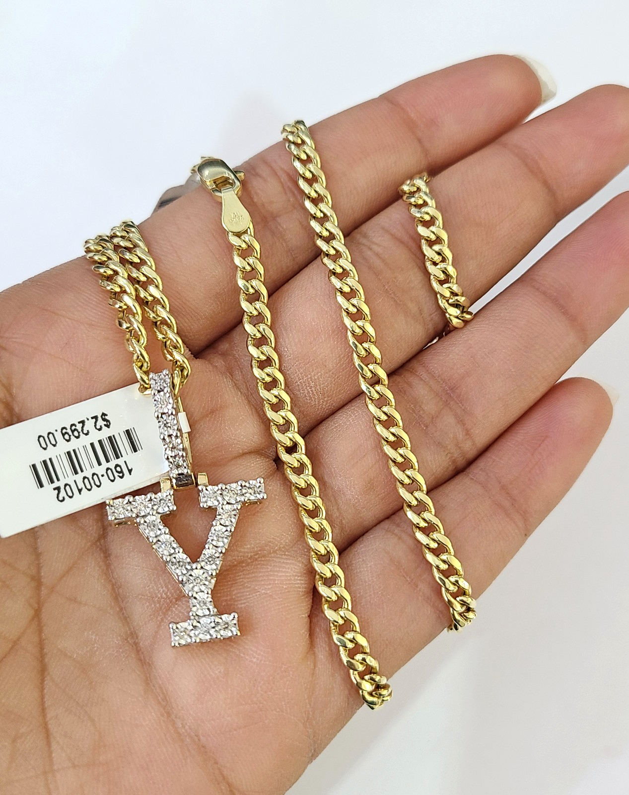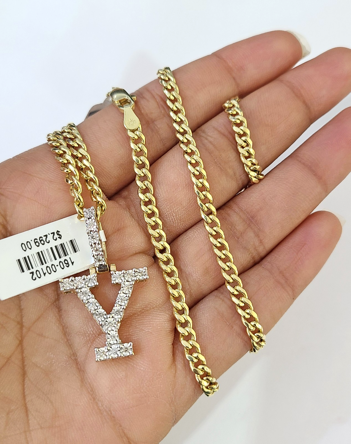 10K Gold Miami Cuban Chain Y Diamond Initial 20"-28" 3mm Pendant Necklace SET