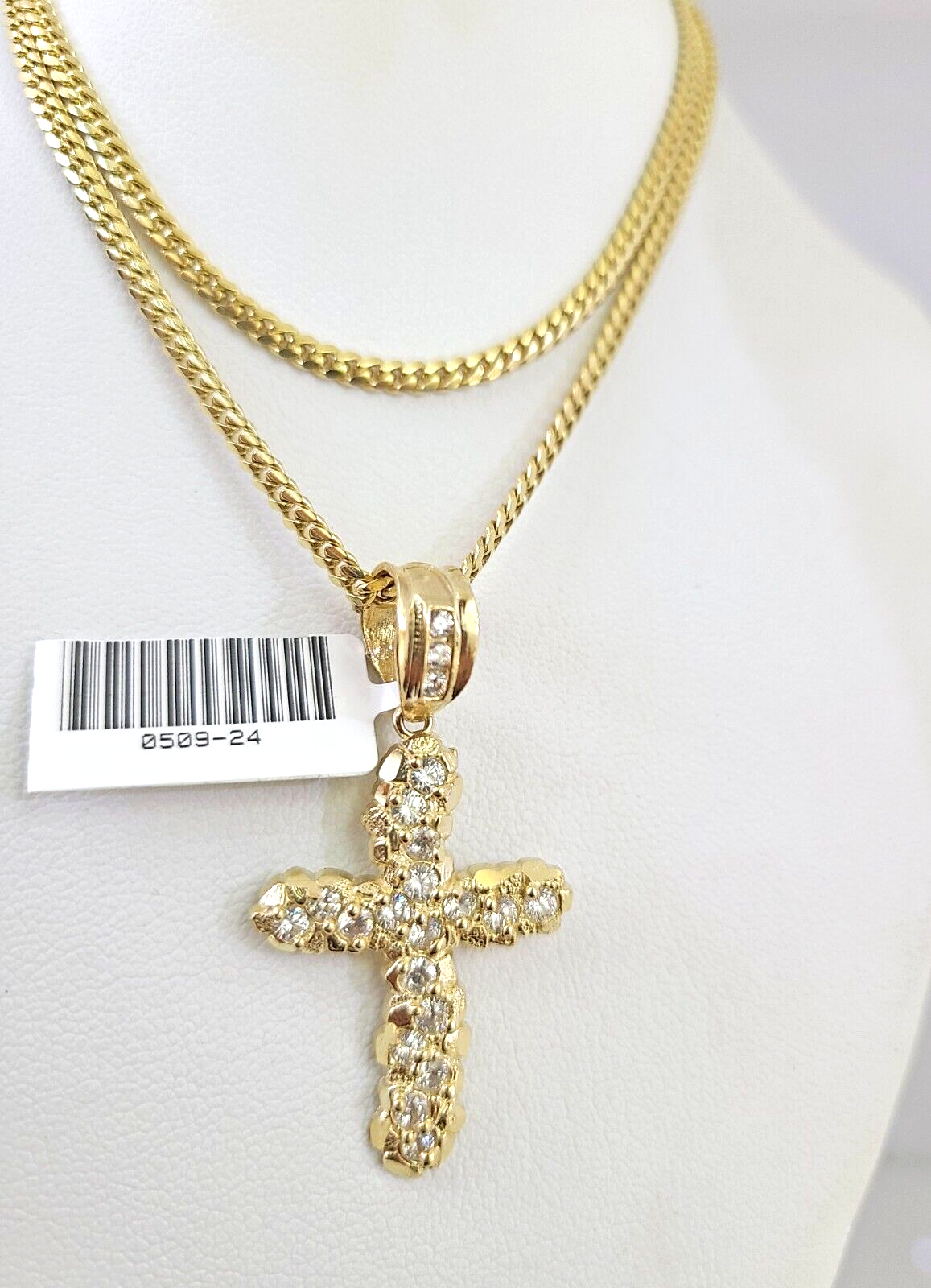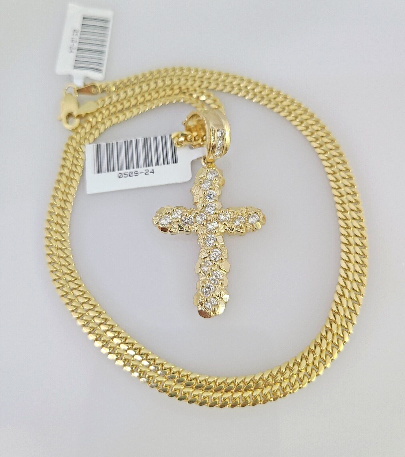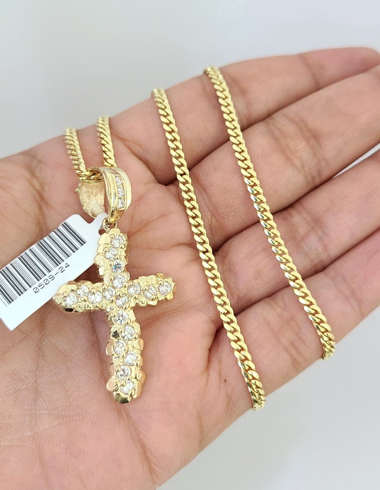10k Gold Solid Miami Cuban Necklace Jesus Cross Pendant 2.5mm 18-24" Chain Set