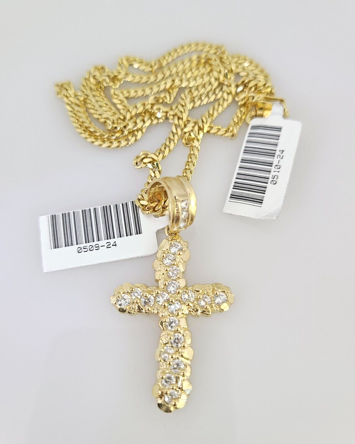 10k Gold Solid Miami Cuban Necklace Jesus Cross Pendant 2.5mm 18-24" Chain Set - 20 Inch