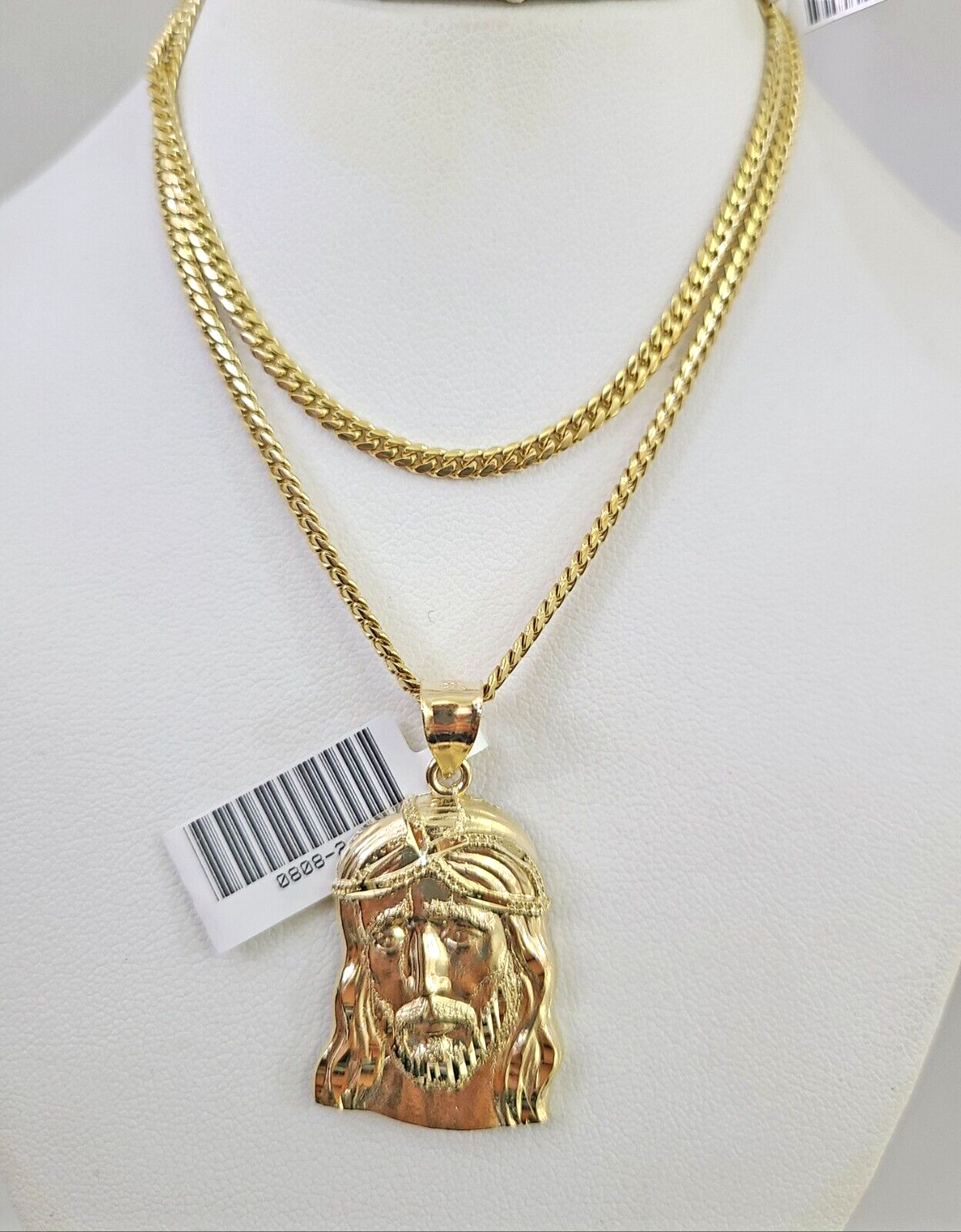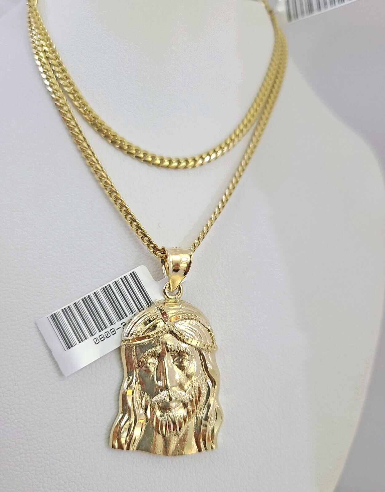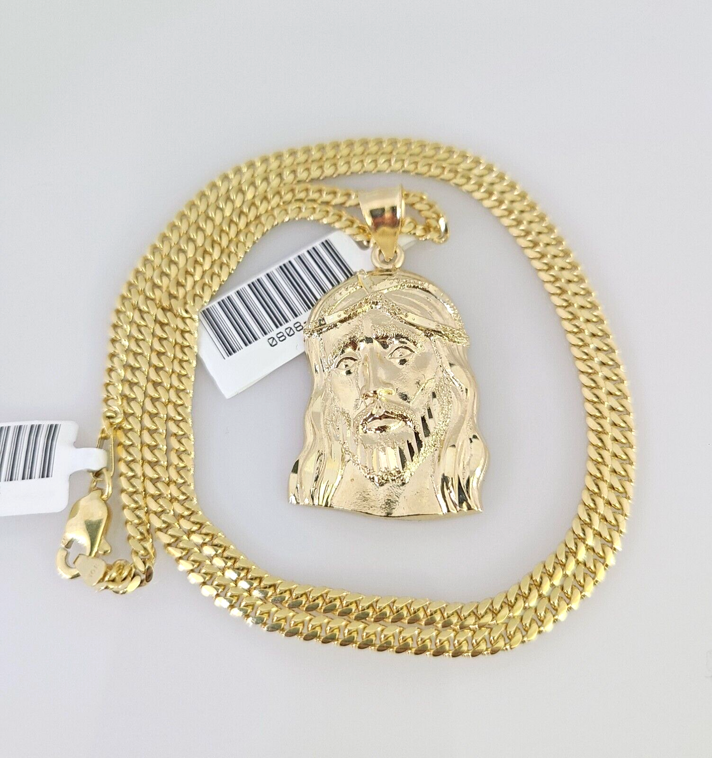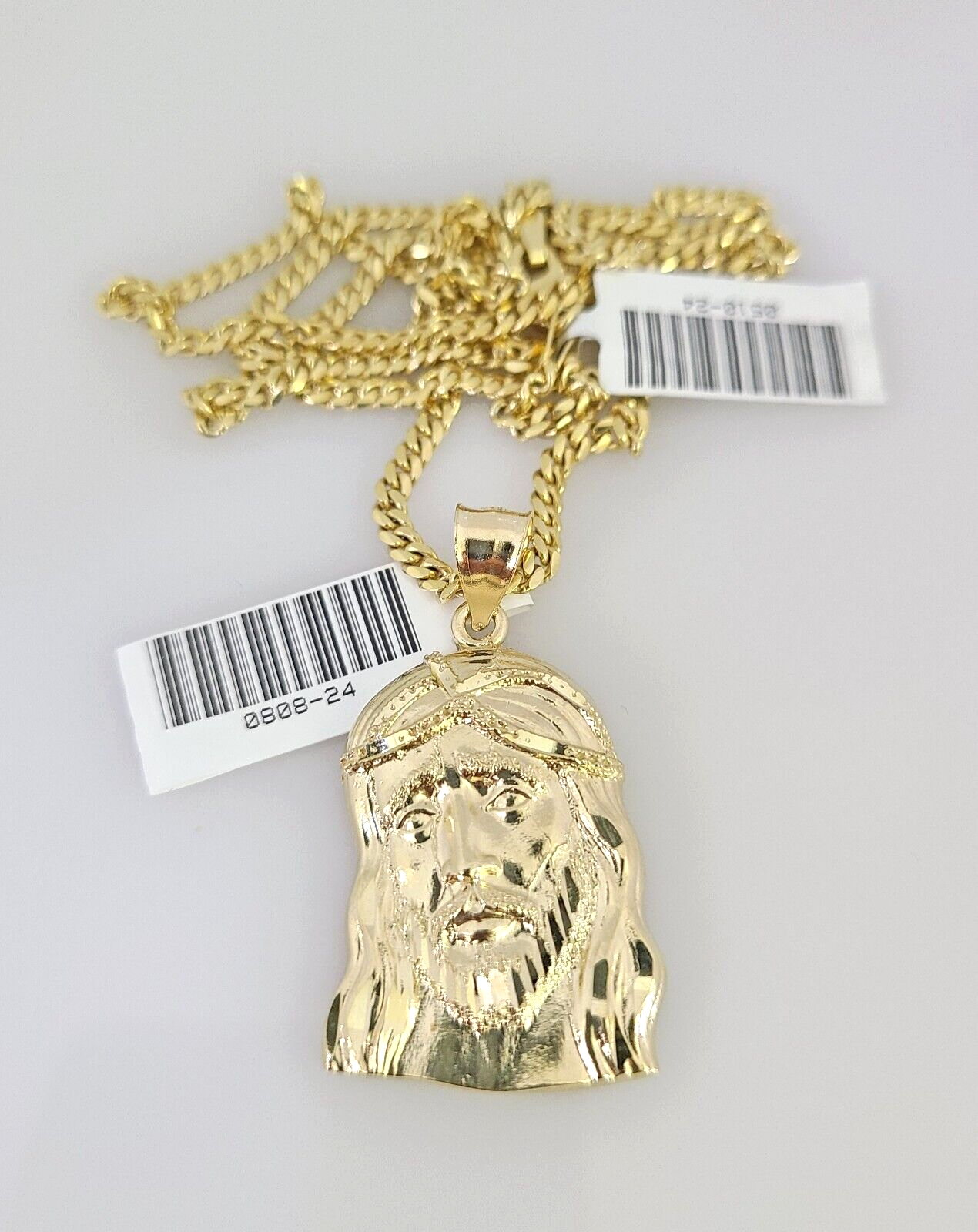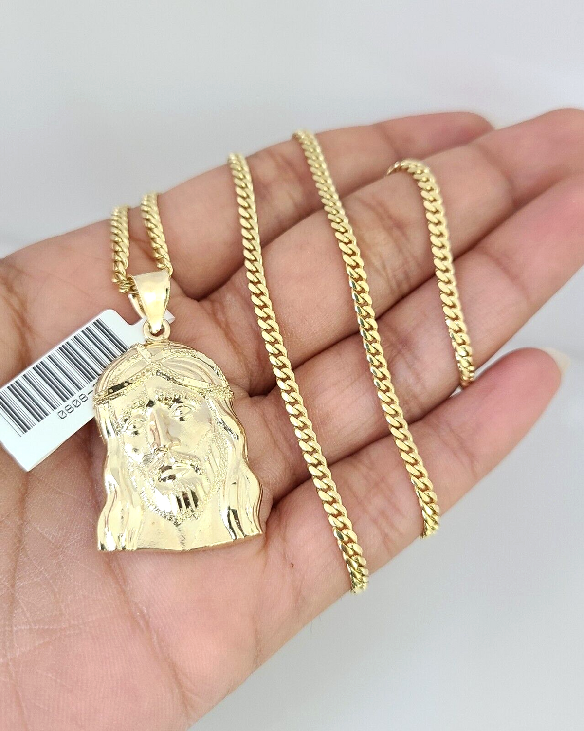 10k Gold Solid Miami Cuban Necklace Jesus Head Pendant 2.5mm 18-24" Chain Set - 20 Inch
