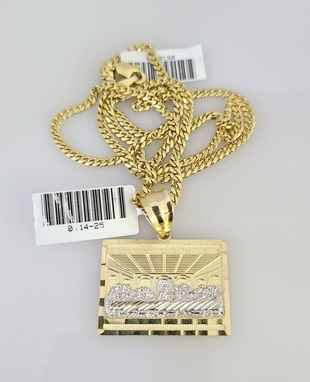 Genuine 10k Yellow Gold Miami Cuban Necklace 2.5mm Chain With Last Supper Charm. The Various length of the Chain are 18"-24" with Last Supper Charm. The pendants are unique in design and considered durable too. If you are not happy with the way it looks or feels, we do offer 30 - Days FREE Return shipping. Contact us for more information.