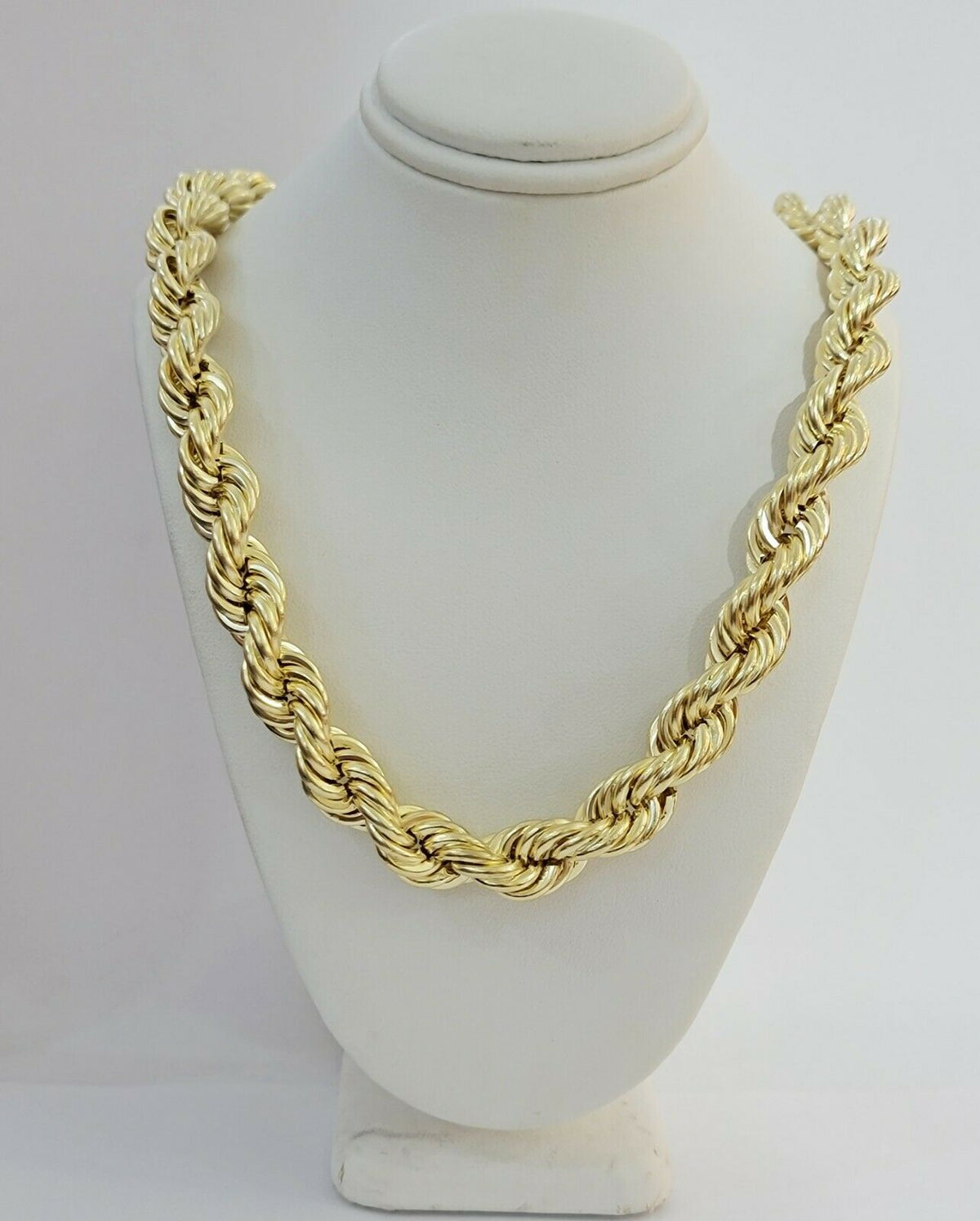 10 KT Yellow Gold ( Real , Not plated , Not filled ) Rope Necklace chain. The Width of the necklace is 12 MM and in Various Length stating From 20 Inches, 22 Inches and 24 Inches, 26 Inches, 28 Inches, 30 Inches The Clasp is Lobster Lock. The chain is considered durable. If you are not happy with the way it looks or feels, we do offer