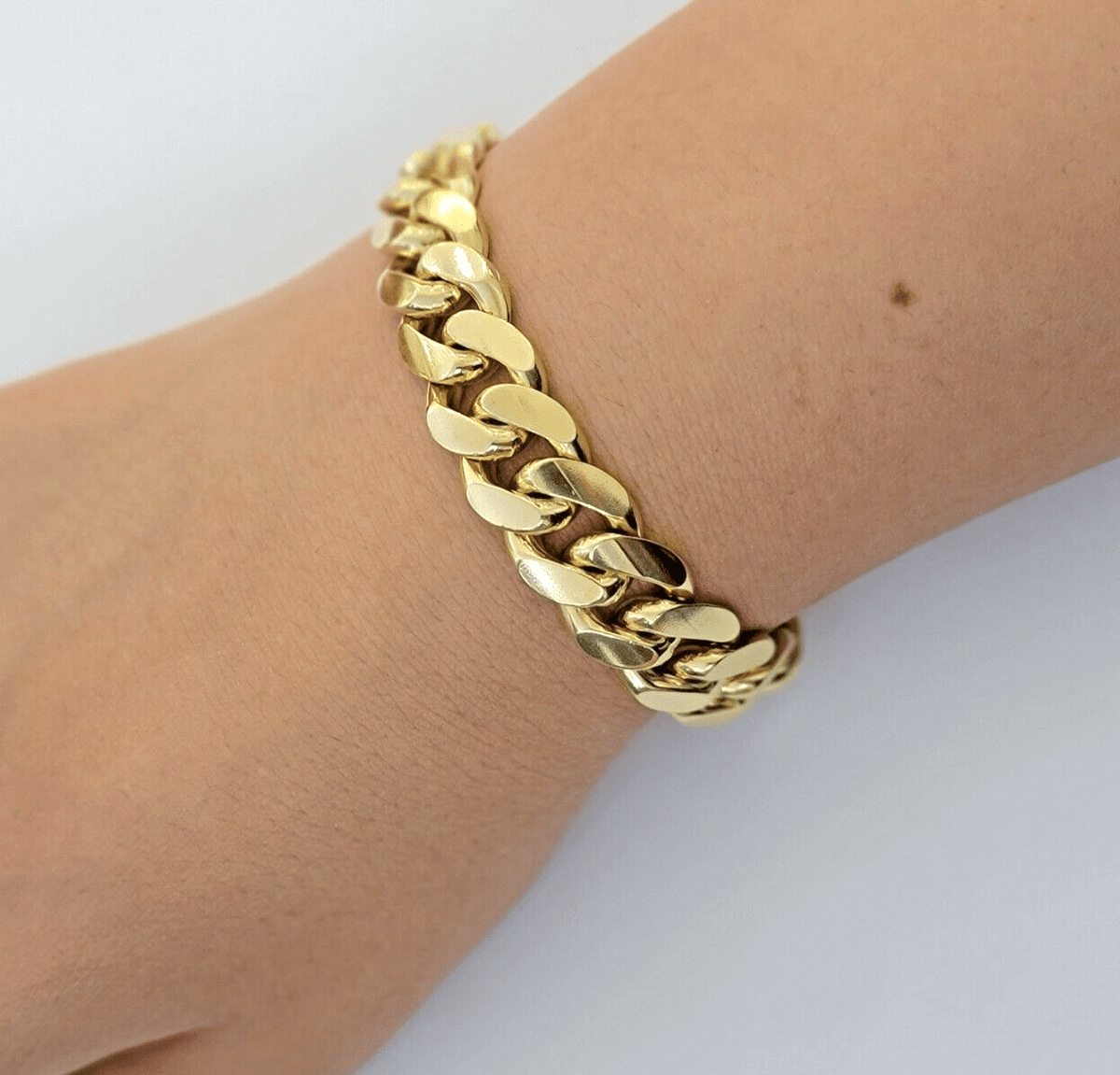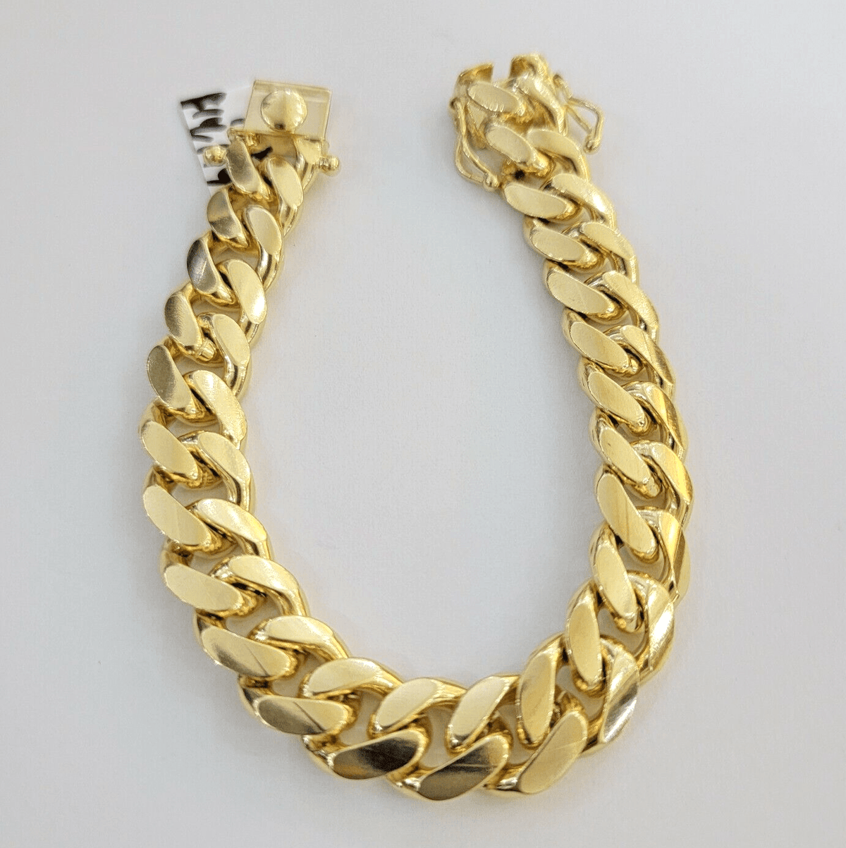SOLID 14 K Yellow Gold ( Real , Not plated , Not filled ) Miami Cuban-Link Bracelet For Men's. The Width of the Bracelet is 13 mm (approx.) and 9 Inch Long . The Clasp is Box Lock which is strong and safe lock for the bracelet. The bracelet is beautiful designed with Cuban-Link style. If you are not happy with the way it looks or feels, we do offer free return. Buyers need to make sure that the return item has to be in its original sent/ brand new condition with original tag attached. Violation in return policy might result in negative consequence.