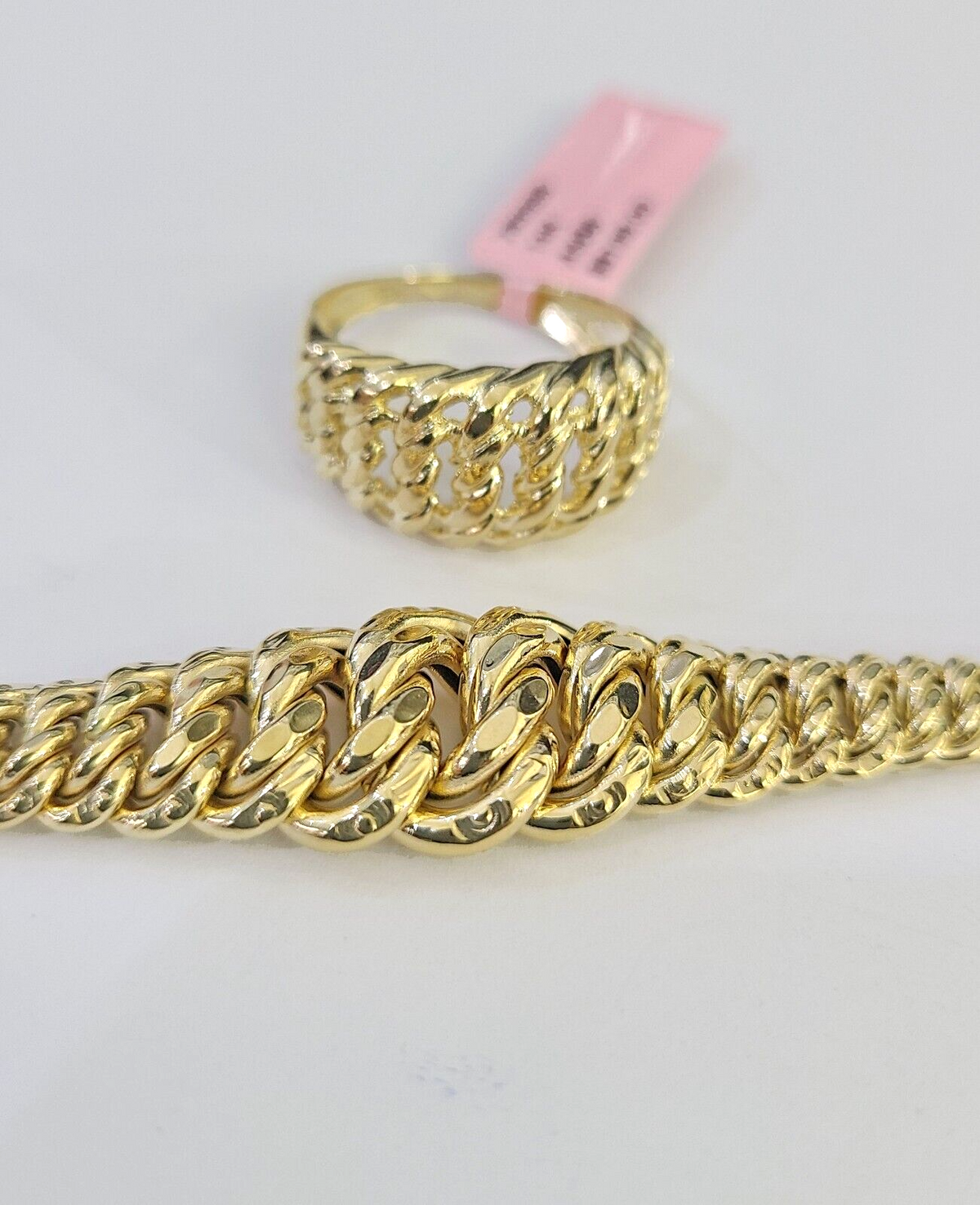 Is Presenting You with This Absolutely Stunning Real 14k Yellow Gold Flat Byzantine Link Princesa Ring and 7mm 7" Bracelet SET with Lobster Lock. These Ring's/ Bracelet links are very strong and have a safety lock on a sides. These Beautiful Ring/ Bracelet will not tarnish, discolor, or fade because they are Pure 14K Gold. We also have them in various another length. A7B5 A5B6