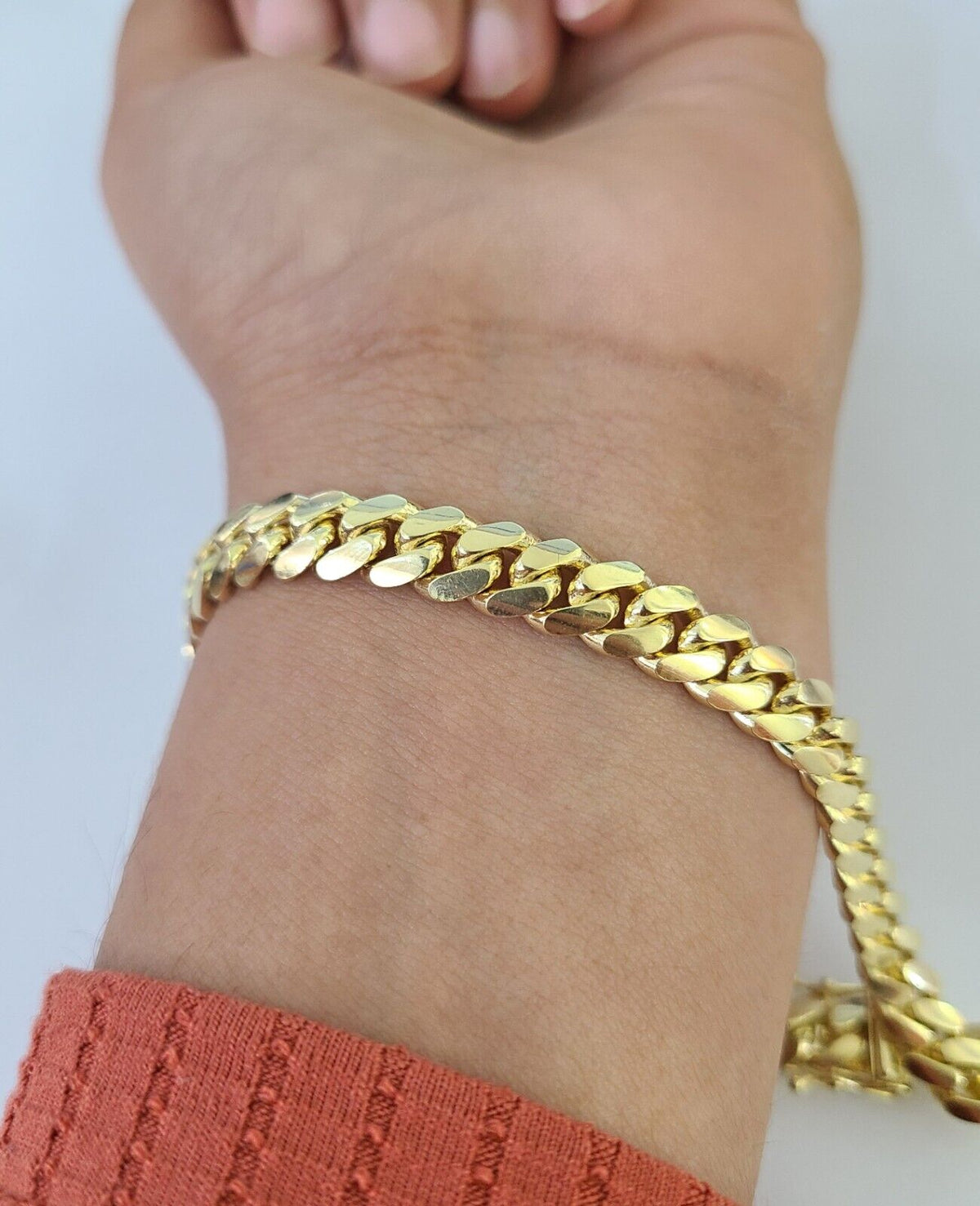 Is Presenting You with This Absolutely Stunning Real 14k Yellow Gold Cuban Link Bracelet 8.5" Inch (approx.) 7mm bracelet. These Beautiful hand Bracelets will not tarnish, discolor, or fade because they are Pure 14K Gold. We also have them in various another sizes. Please feel free to contact us if you have any queries regarding the item.