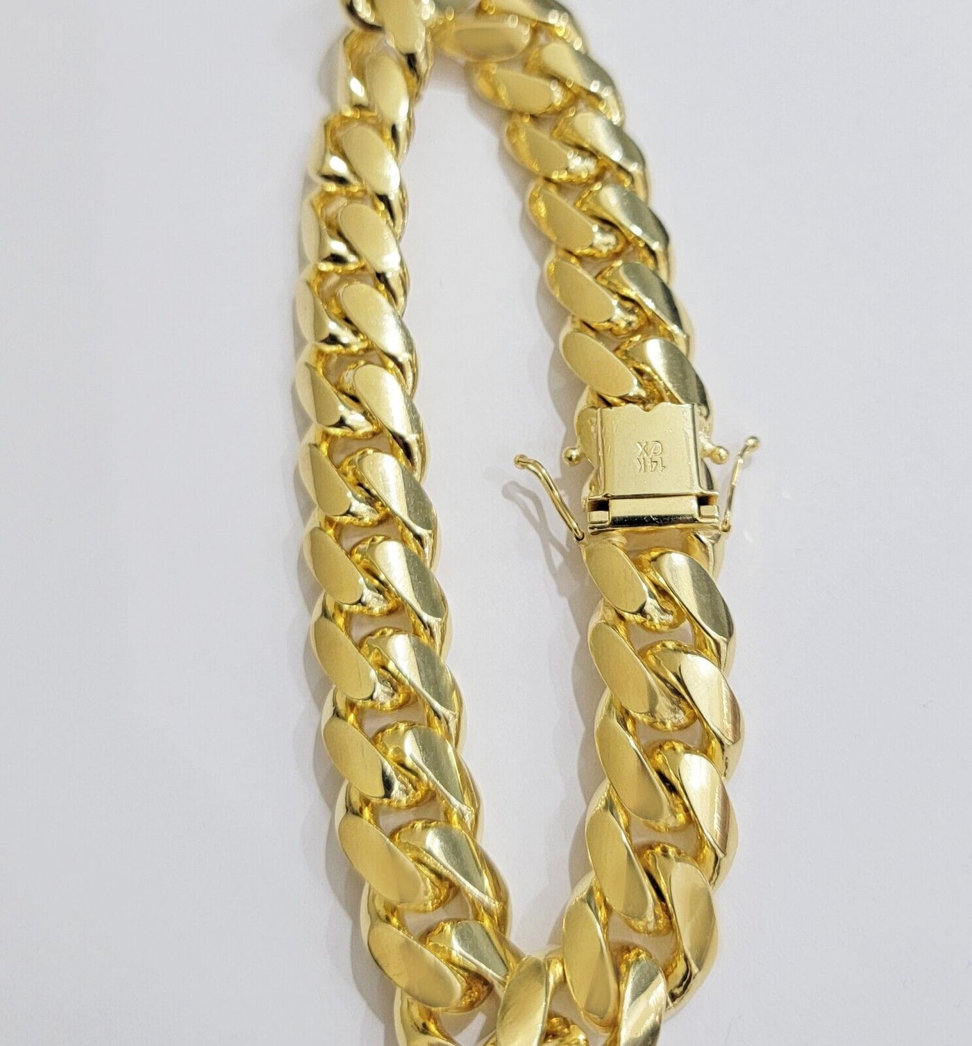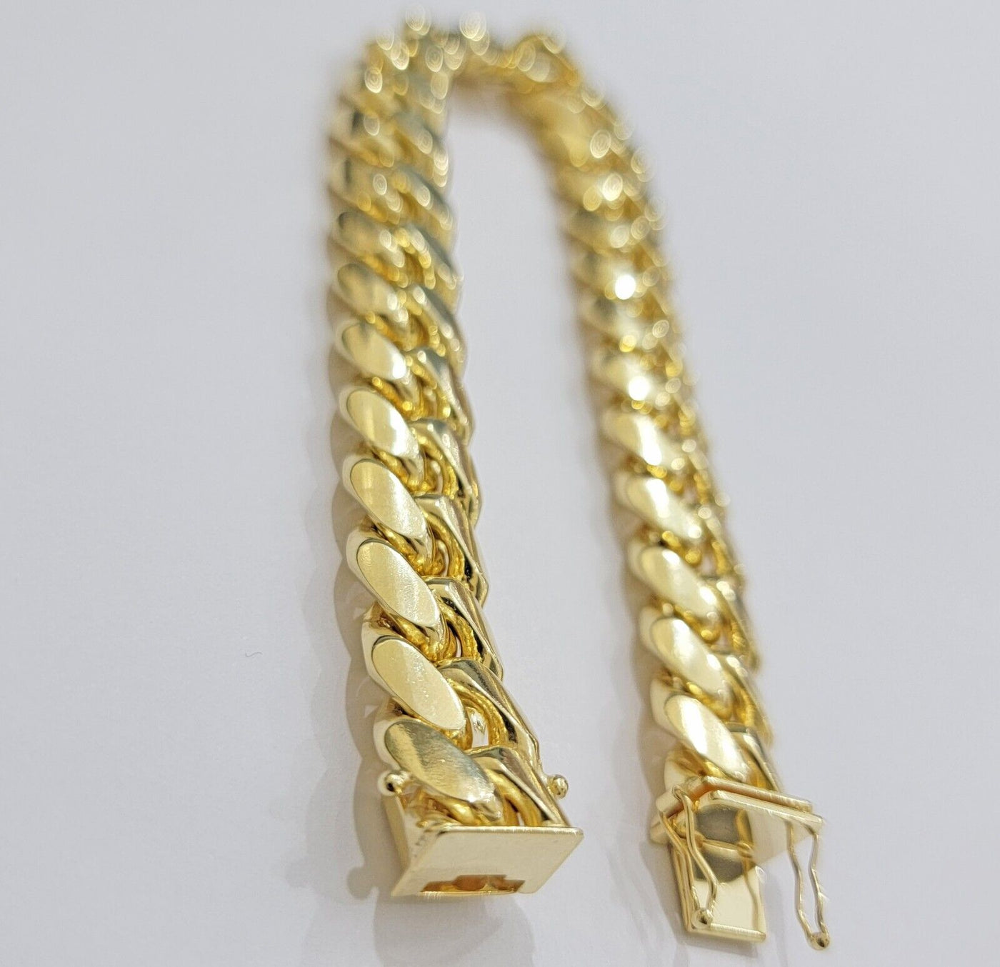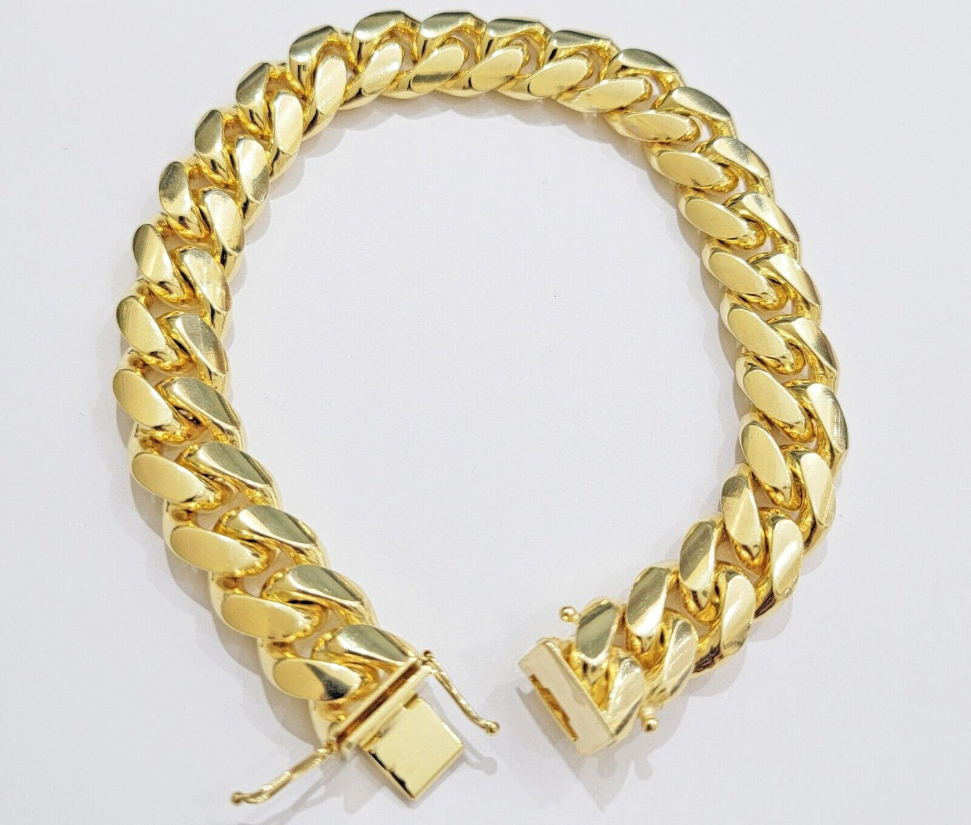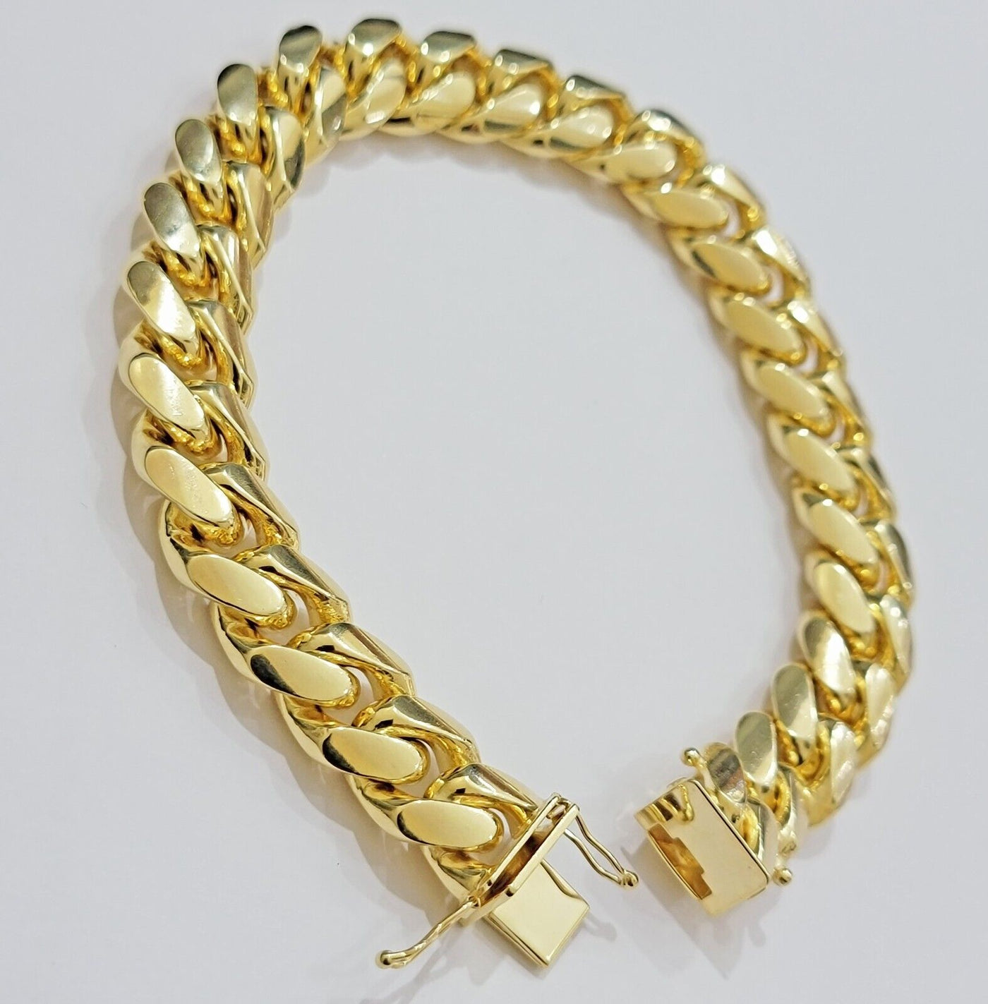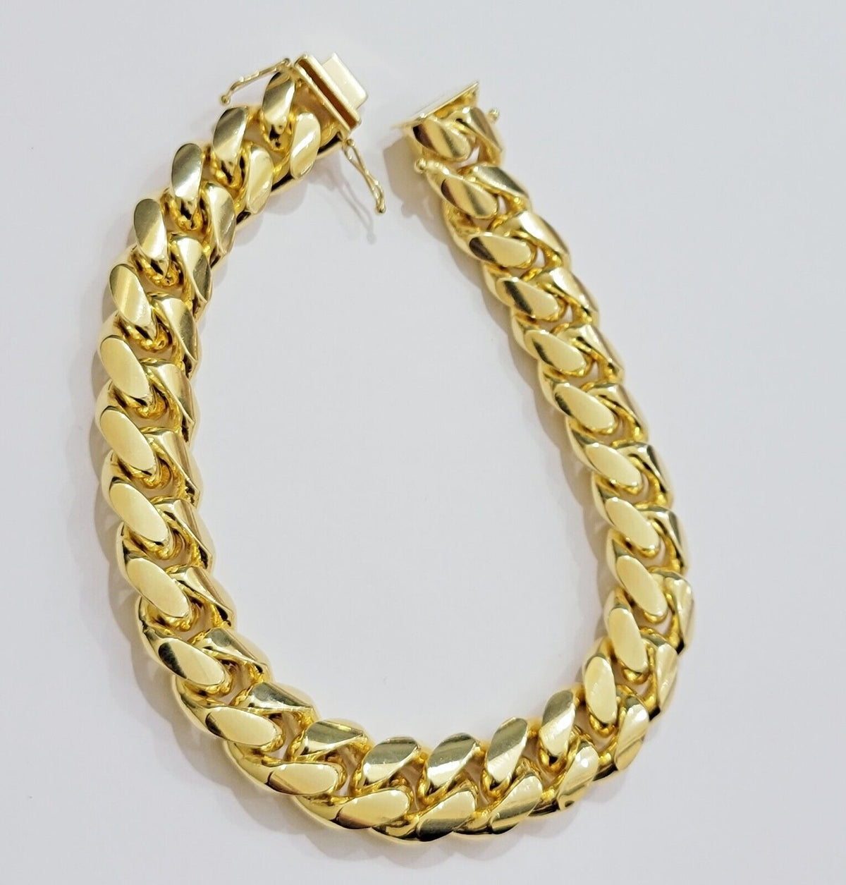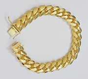 SOLID 14 K Yellow Gold ( Real , Not plated , Not filled ) Miami Cuban-Link Bracelet For Men's. The Width of the Bracelet is 13 mm (approx.) and 9.5 Inch Long . The Clasp is Box Lock which is strong and safe lock for the bracelet. The bracelet is beautiful designed with Cuban-Link style. If you are not happy with the way it looks or feels, we do offer free return. Buyers need to make sure that the return item has to be in its original sent/ brand new condition with original tag attached. Violation in return policy might result in negative consequence.