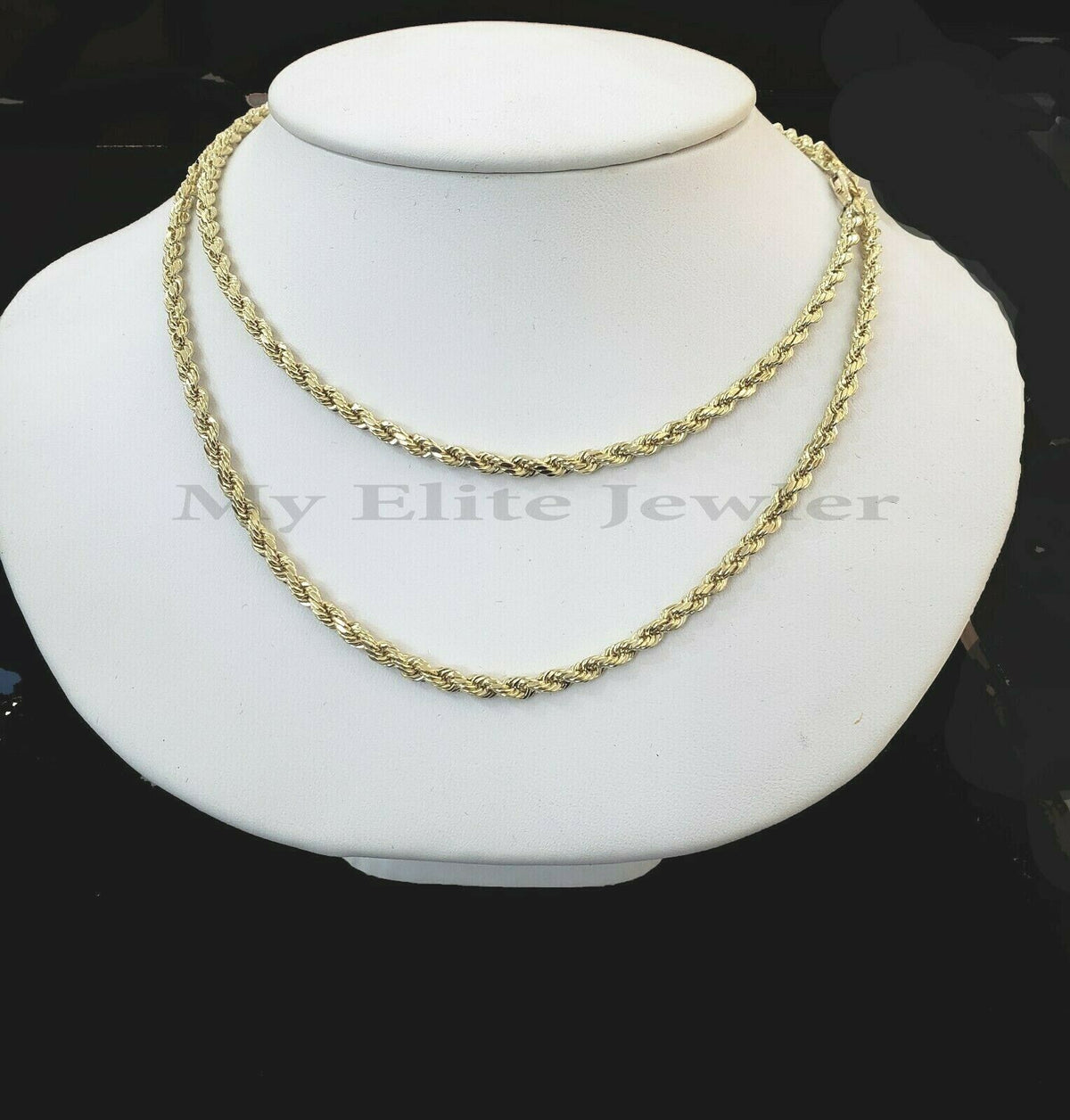 14 k Yellow Gold Rope chain. The Width of the necklace is 3MM and Various Length starting From 18 Inches - 26 Inches. The Clasp is lobster. The chain can be worn with the pendants. If you are not happy with the way it looks or feels, we do offer 30 - Days FREE Return shipping. Contact us for more information.