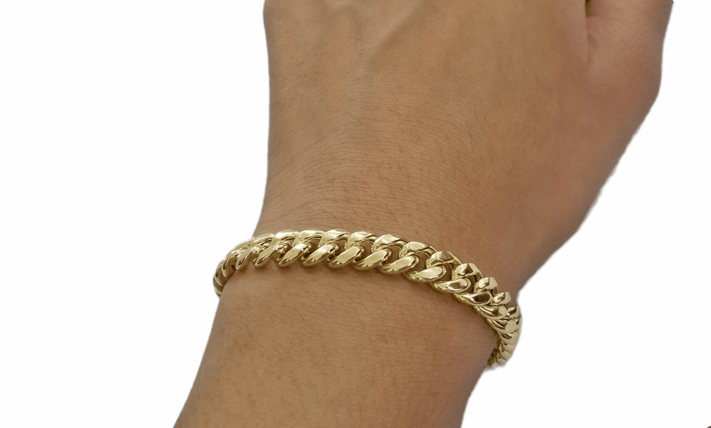 Is Presenting You with This Absolutely Stunning Real 14k Yellow Gold Miami Cuban Bracelet 7 mm, 8 Inches, Box Lock. The links are very strong and have a box lock with the two safety clasp on sides.��These Beautiful bracelets will not tarnish, discolor, or fade because they are Pure 14K Gold.��