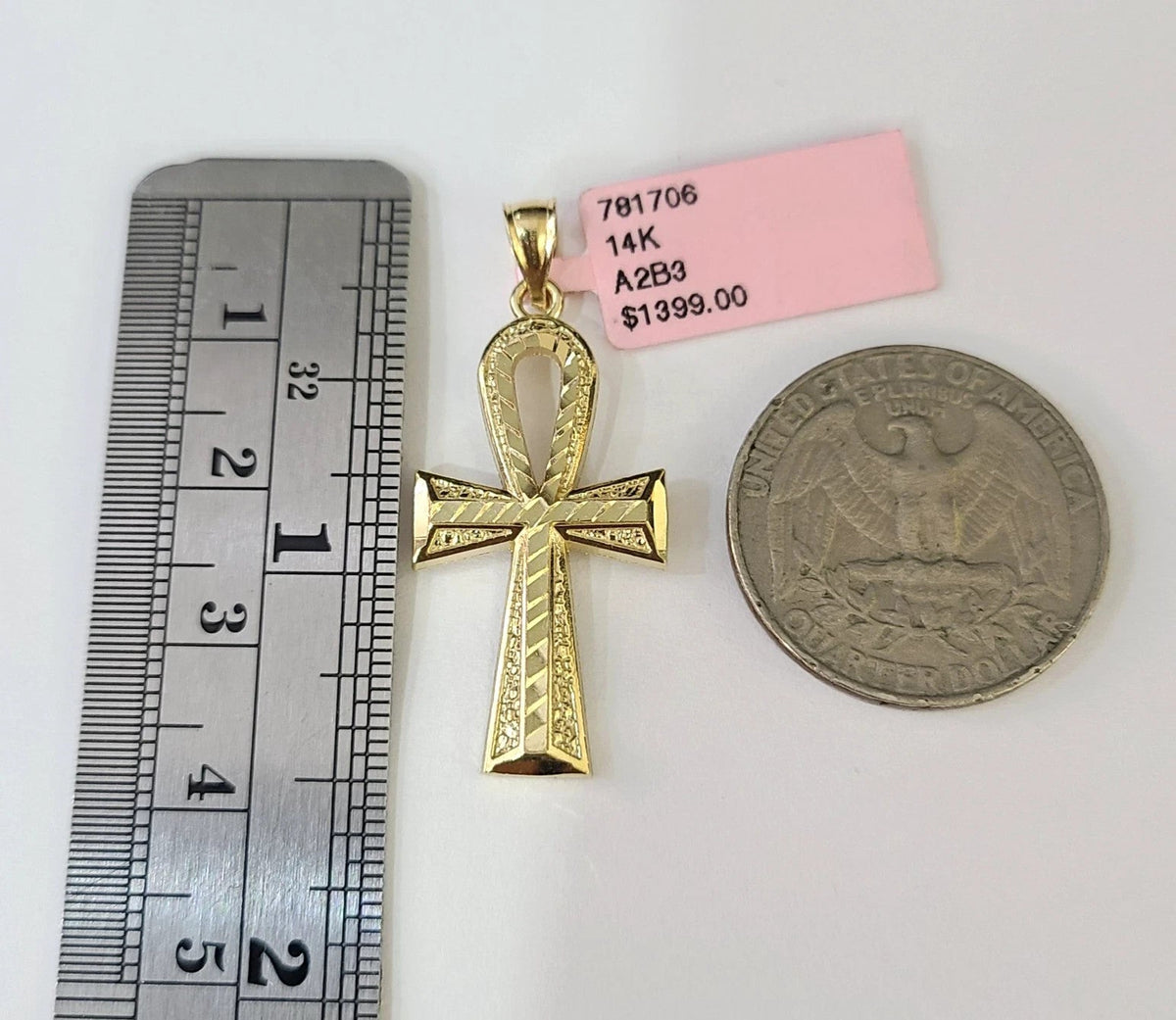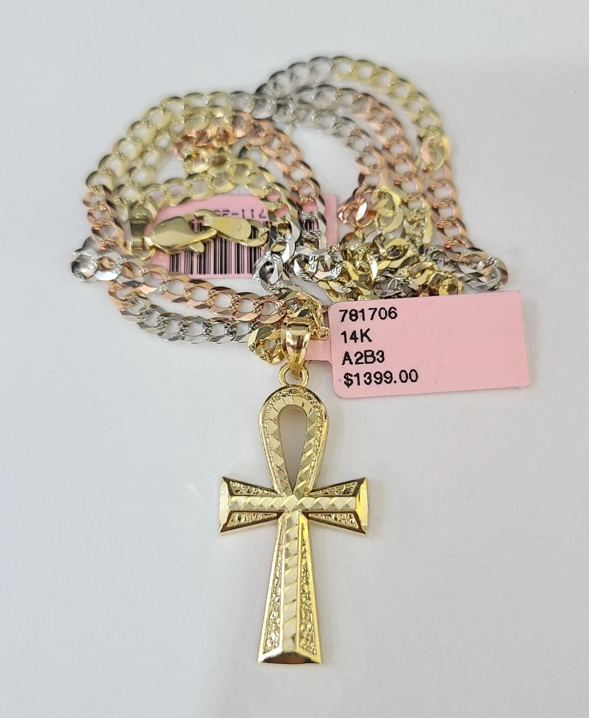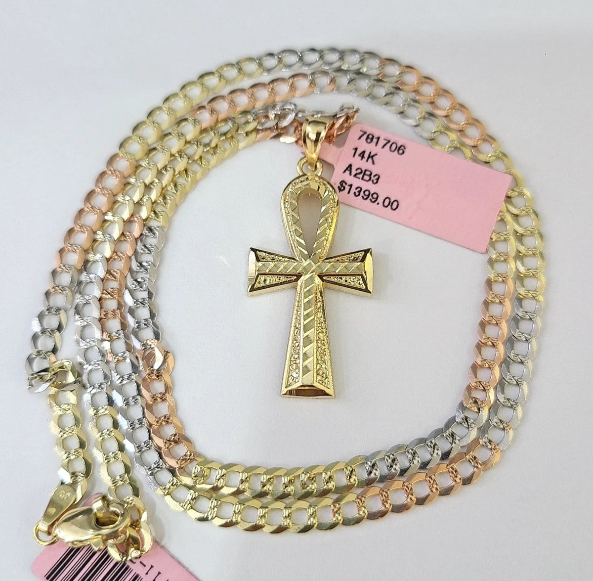 14k Chain Ankh Cross Pendant Charm Solid TriColor Cuban Curb 4mm 18"-28" Inch - 18 inches Chain & Charm