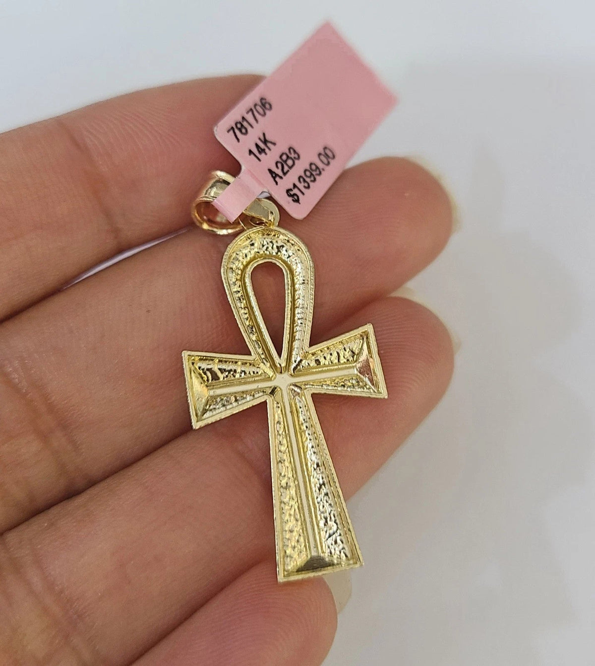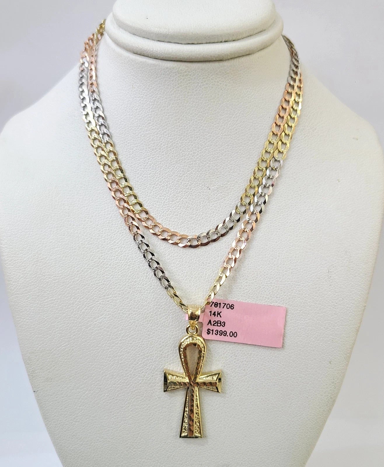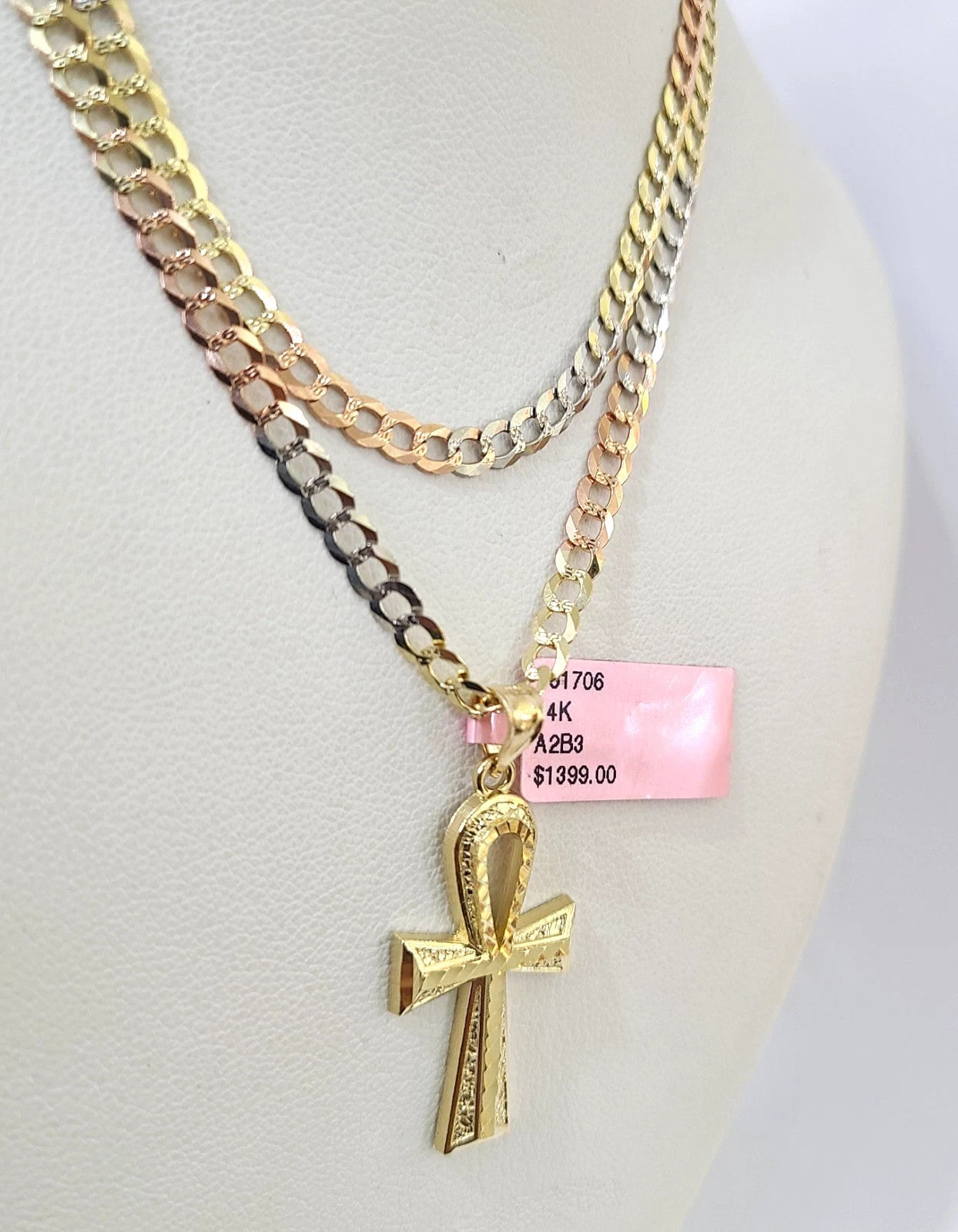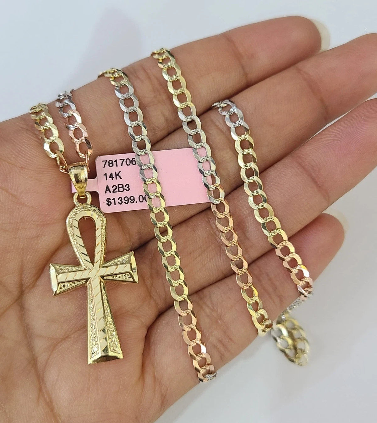 14k Chain Ankh Cross Pendant Charm Solid TriColor Cuban Curb 4mm 18"-28" Inch