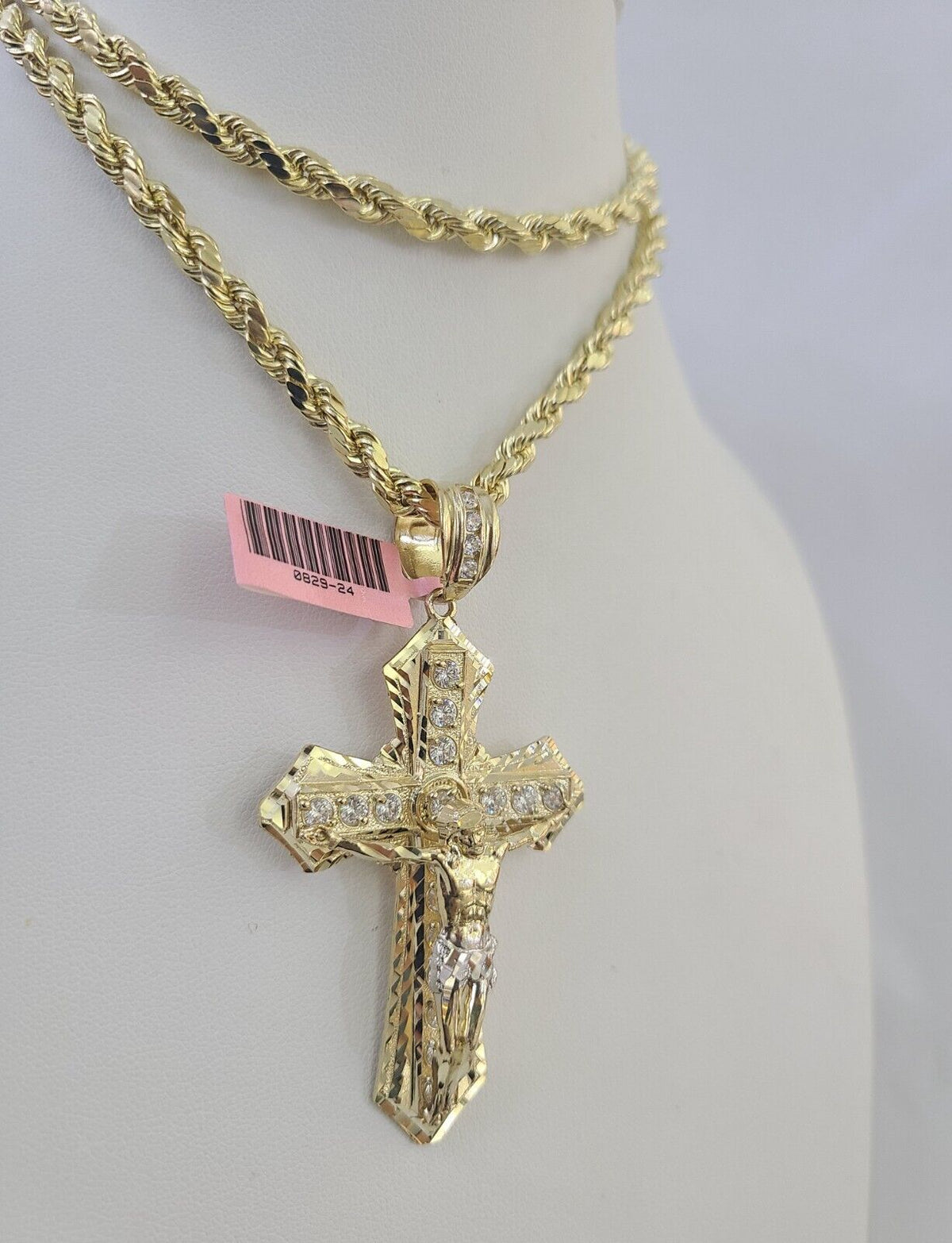 Real 14k Rope Chain Jesus Cross Charm Yellow Gold Set 5mm 20"-30" Necklace