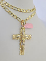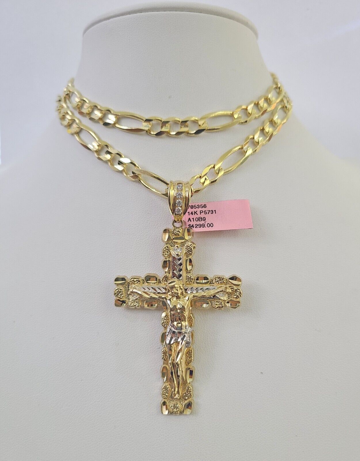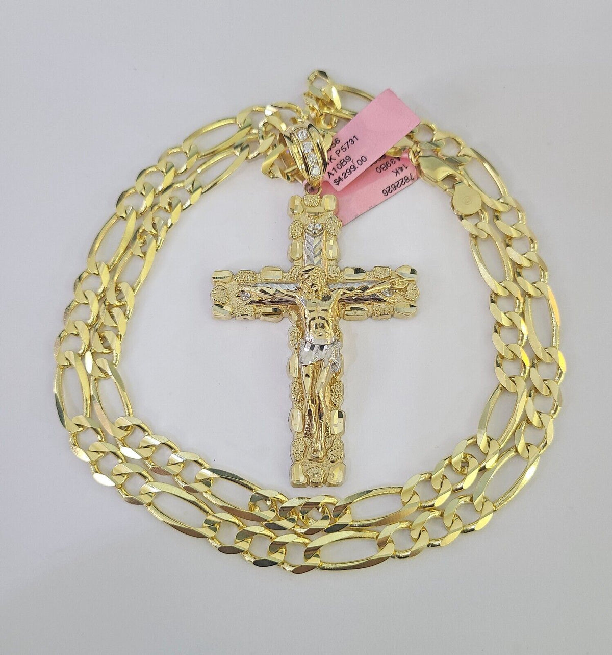 Is Presenting You with This Beautifully Designed Real 14k Yellow Gold Jesus Cross Charm Pendant with 14k 7mm Figaro Chain in various lengths. Please feel free to contact us if you have any queries regarding the item. These Beautiful chains and pendants will not tarnish, discolor, or fade because they are Pure 14K Gold. 24"-A39B0 , A10B9