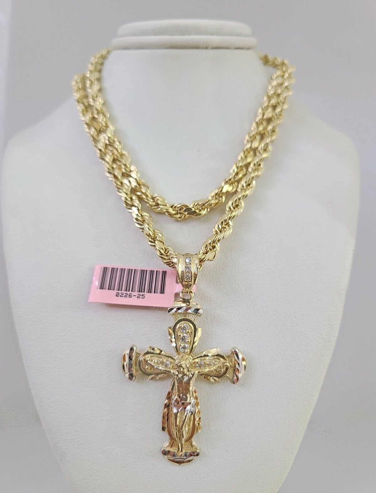 Genuine 14k Yellow Gold Rope Chain 6mm With Jesus Crucifix Cross design. The Various length of the Chain are 18"-28" with Jesus Crucifix Cross. The pendants are unique in design and considered durable too. The stones are cubic zirconia If you are not happy with the way it looks or feels, we do offer 30 - Days FREE Return shipping. Contact us for more information.