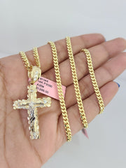 Genuine 14k Yellow Gold Solid Miami Cuban link Chain 3mm With Nugget Jesus Cross Diamond Cuts design. The Various length of the Chain are 18"-24". The pendants are unique in design and considered durable too. If you are not happy with the way it looks or feels, we do offer 30 - Days FREE Return shipping. Contact us for more information.