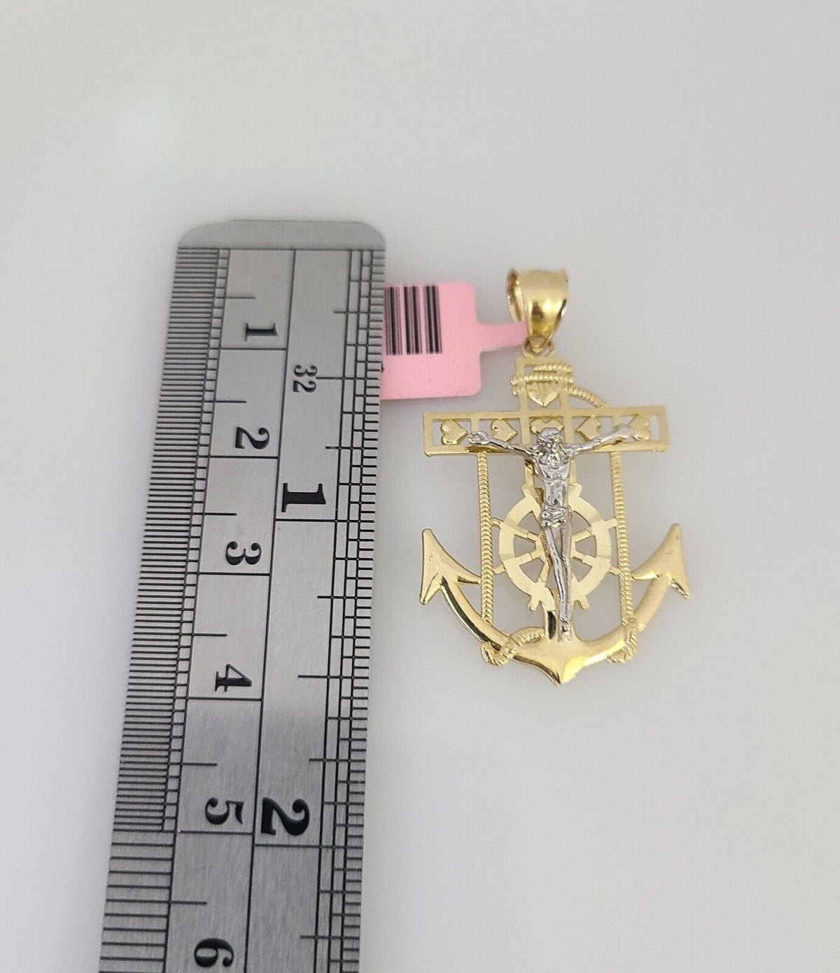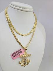 14k Gold Solid Chain Jesus Anchor Pendant Set 14kt Miami Cuban Link 3mm Charm