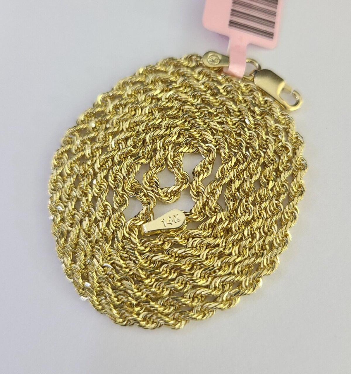 We present You with This Absolutely Stunning Real 14k Yellow Gold Rope Chain. It has a detailed cut with a very good finish. These Beautiful Pendants will not tarnish, discolor, or fade because they are Pure 14K Gold. Please feel free to contact us if you have any queries regarding the item. 24"-A11B6