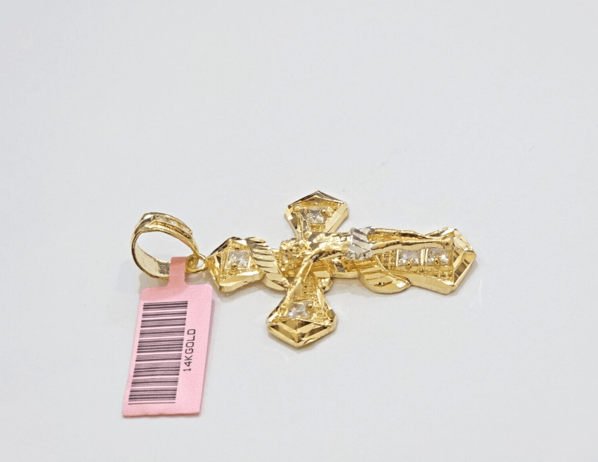 14k Yellow Gold Cross Charm Jesus Pendant 2 Inch CZ Crucifix For Chain 14kt SALE
