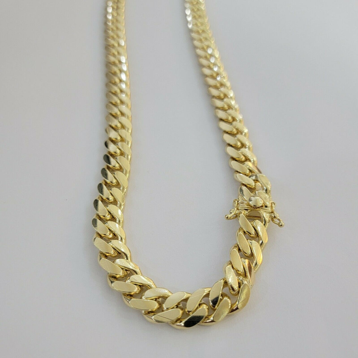 SOLID ( Heavy) 14 K Yellow Gold ( Real , Not plated , Not filled ) Miami Cuban-Link 8mm Chain For Men's . The length is 24 Inch Long and Width of the Necklace is 8 mm ( approx.) . The Clasp is box Lock with two other safety clasp in sides which is strong. The chain is beautiful designed with Cuban-Link style. If you are not happy with the way it looks or feels, we do offer 30 - Days FREE Return shipping.