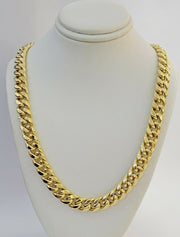 14 k Yellow Gold ( Real , Not plated , Not filled ) Miami Cuban link chain For men's . The Width of the necklace is 9/10 MM and 24 Inches Long. The Clasp is Box Lock. The necklace is 100% guaranteed 14k yellow gold and have been professionally tested and stamped 14k for purity authenticity. We guarantee the purity of the gold to be 14k, and the chains are NOT GOLD PLATED, NOT FILLED. These necklaces are strong and steady and are not easily broken. The chain is considered durable. If you are not happy with the way it looks or feels, we do offer 30 - Days FREE Return shipping.