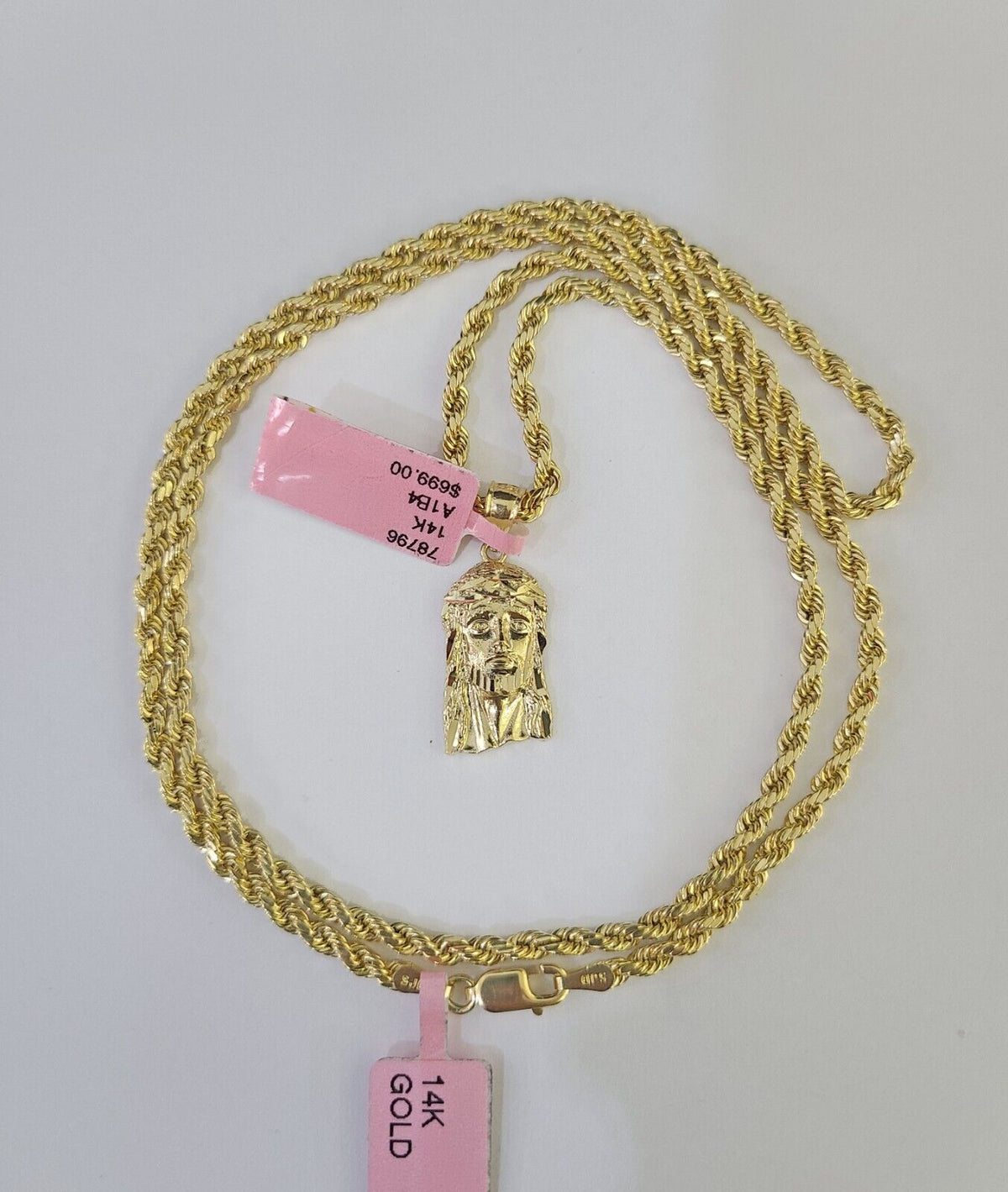 Real 14k Rope Chain Jesus Head Charm Set Yellow Gold 3mm 18-30" Necklace Pendant - With 20 Inch Chain
