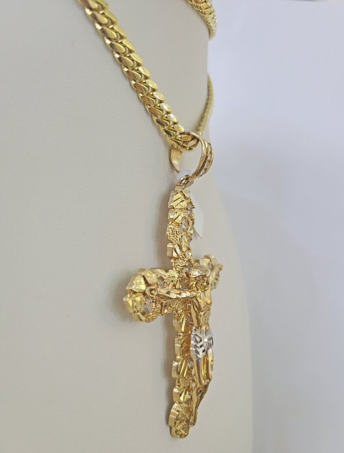 Is Presenting You with This Absolutely Stunning Real 14k Yellow Gold Solid Miami Cuban Link Chain 6mm, 20 inch-30 inches, Lobster Lock with a 14k Jesus Cross Charm Pendant. These Beautiful chains and Pendant will not tarnish, discolor, or fade because they are Pure 14K Gold. We also have them in various another length and sizes. 24"-A68B0 A17B6