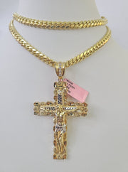 Is Presenting You with This Absolutely Stunning Real 14k Yellow Gold Solid Miami Cuban Link Chain 6mm, 20 inch-30 inches, Lobster Lock with a 14k Jesus Cross Charm Pendant. These Beautiful chains and Pendant will not tarnish, discolor, or fade because they are Pure 14K Gold. We also have them in various another length and sizes. 24"-A68B0 A10B9