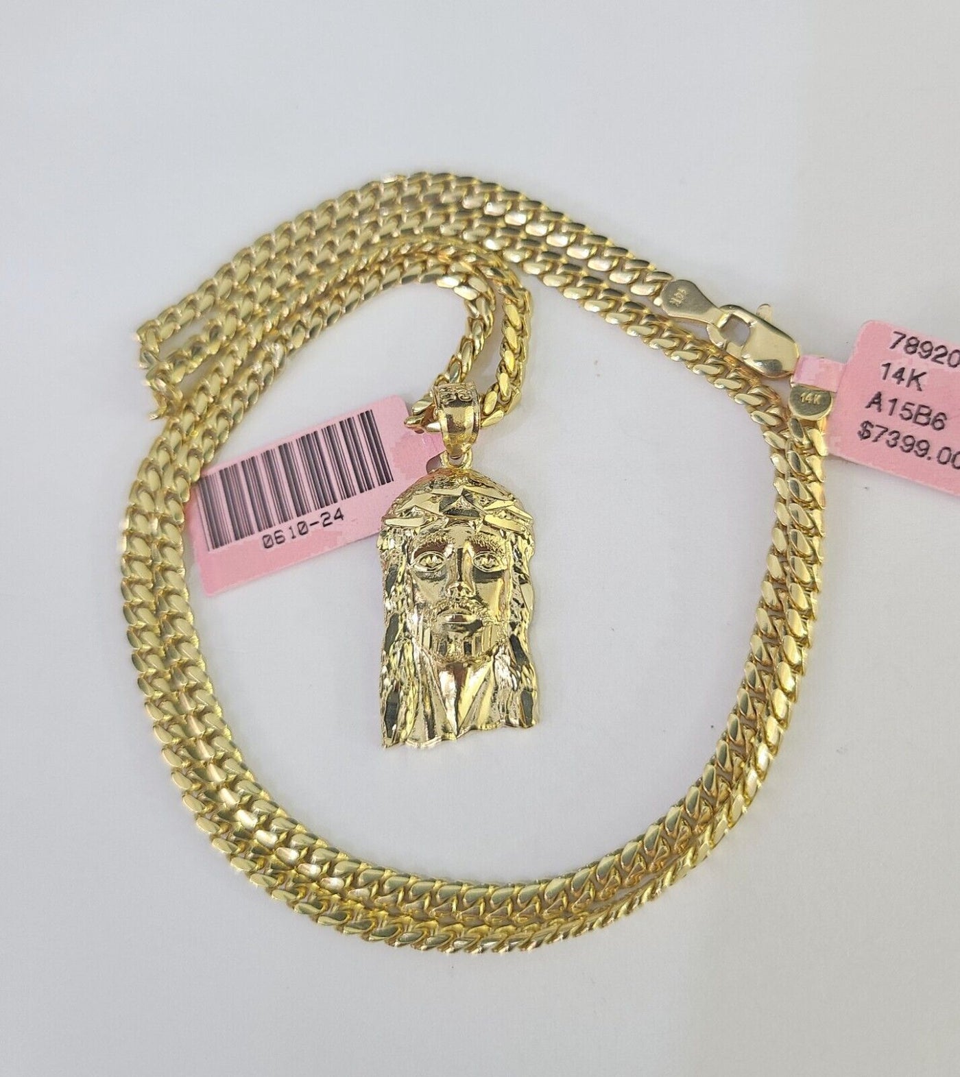 Real 14k Solid Chain Jesus Head Charm Set Miami Cuban 3mm Necklace Pendant
